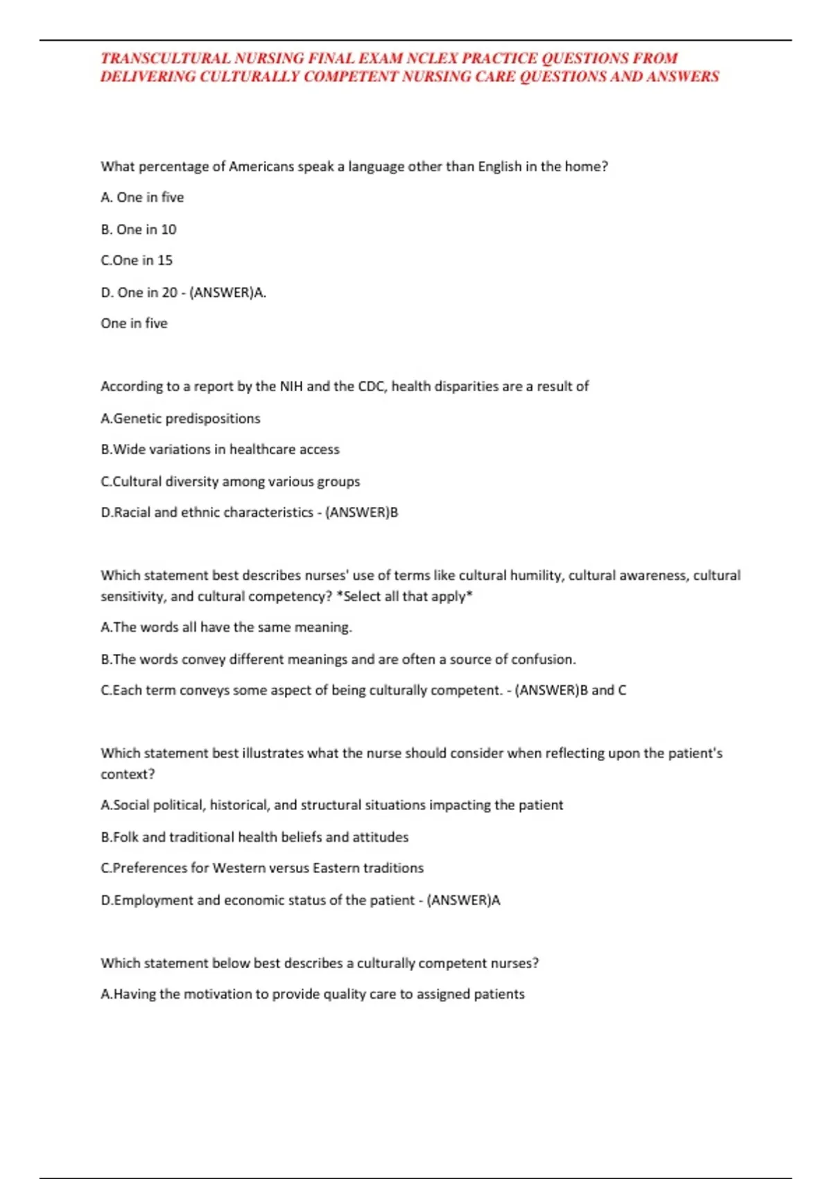 ,TRANSCULTURAL NURSING FINAL EXAM NCLEX PRACTICE QUESTIONS FROM