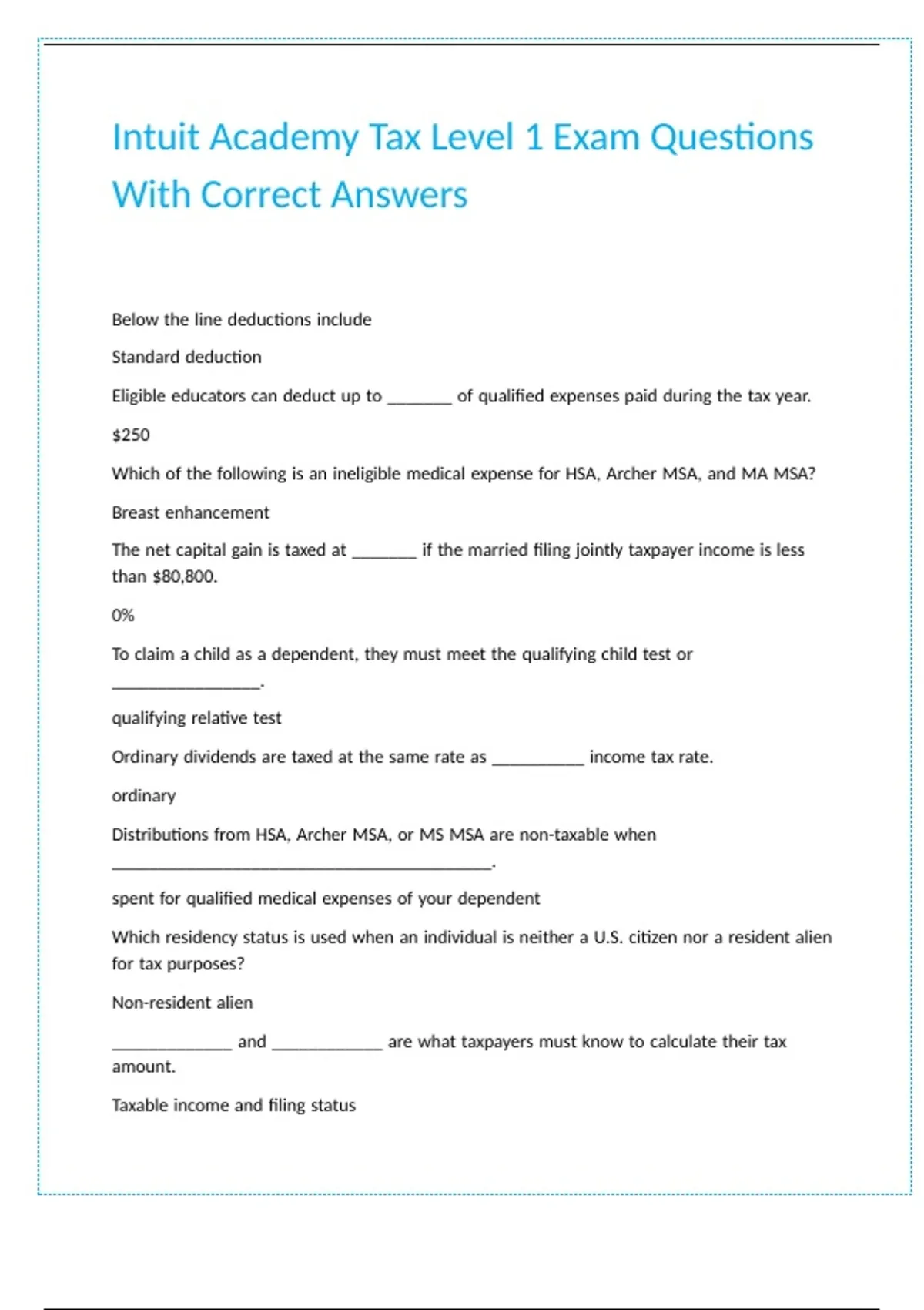 Intuit Academy Tax Level 1 Exam Questions