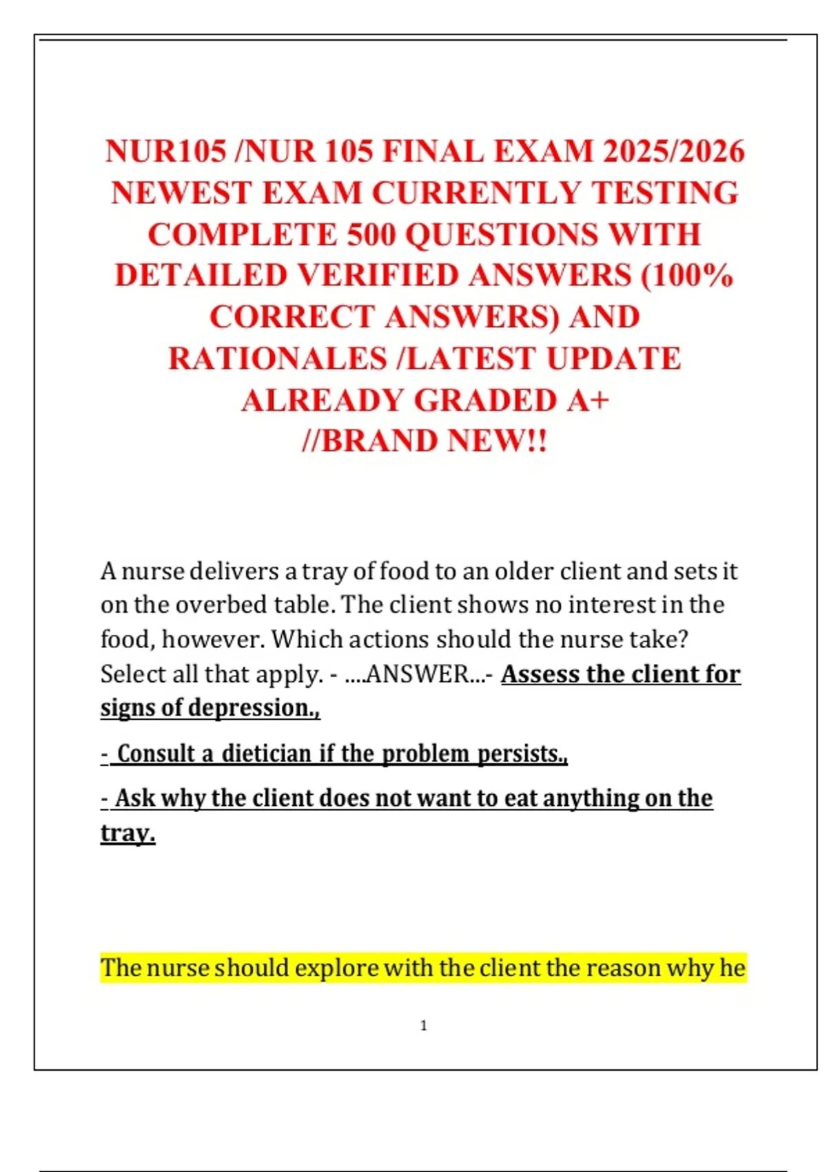 NUR105 /NUR 105 FINAL EXAM 2025/2026 NEWEST EXAM CURRENTLY TESTING COMPLETE 500 QUESTIONS WITH DETAILED VERIFIED ANSWERS (100% CORRECT ANSWERS) AND RATIONALES /LATEST UPDATE ALREADY GRADED A+ //BRAND NEW!!