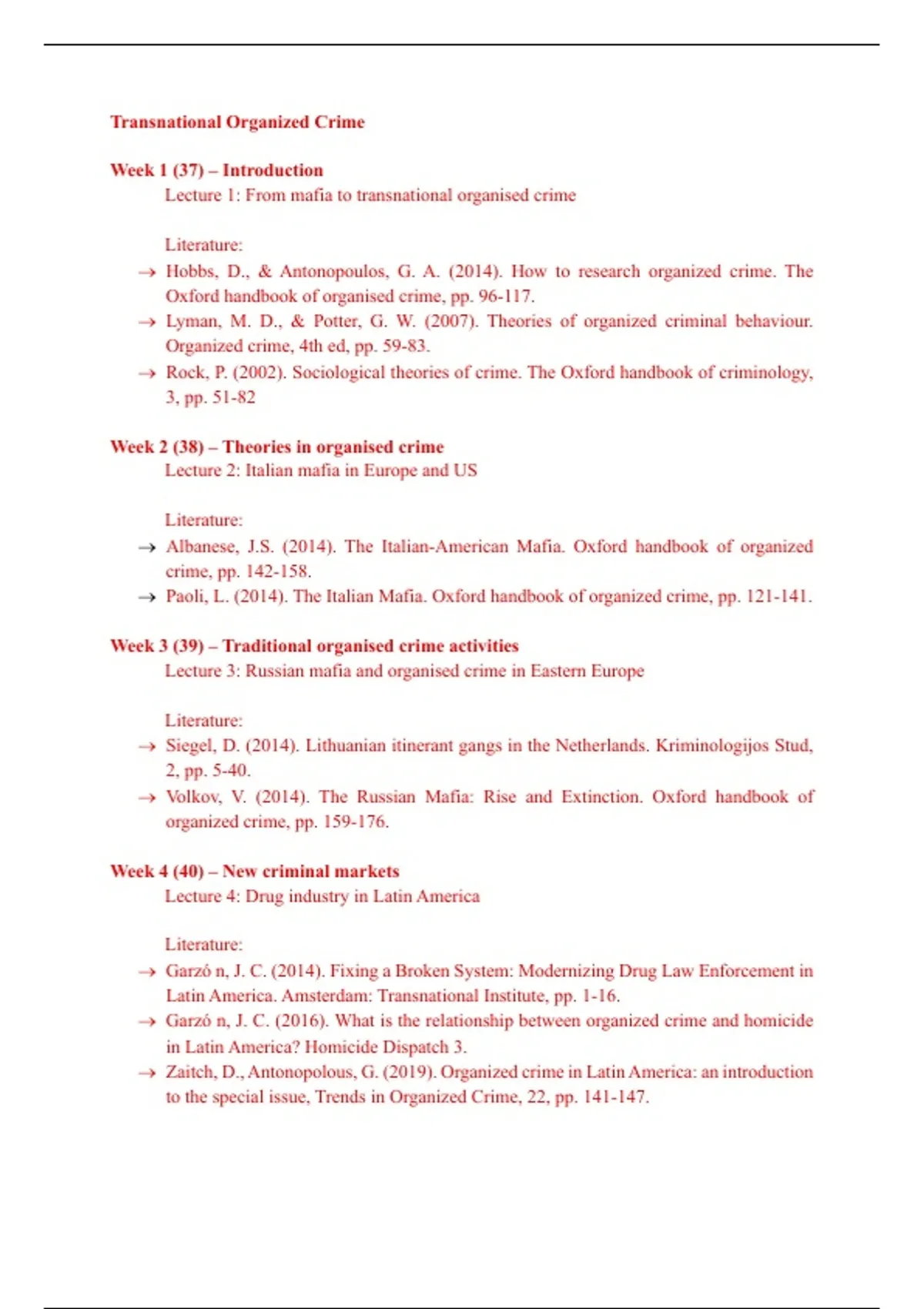 Dit document is een combinatie samenvatting van de hoorcollege en literatuur voor het vak Transnational Organized Crime. De voorgeschreven stof staat op de eerste twee bladzijdes van het pdf.