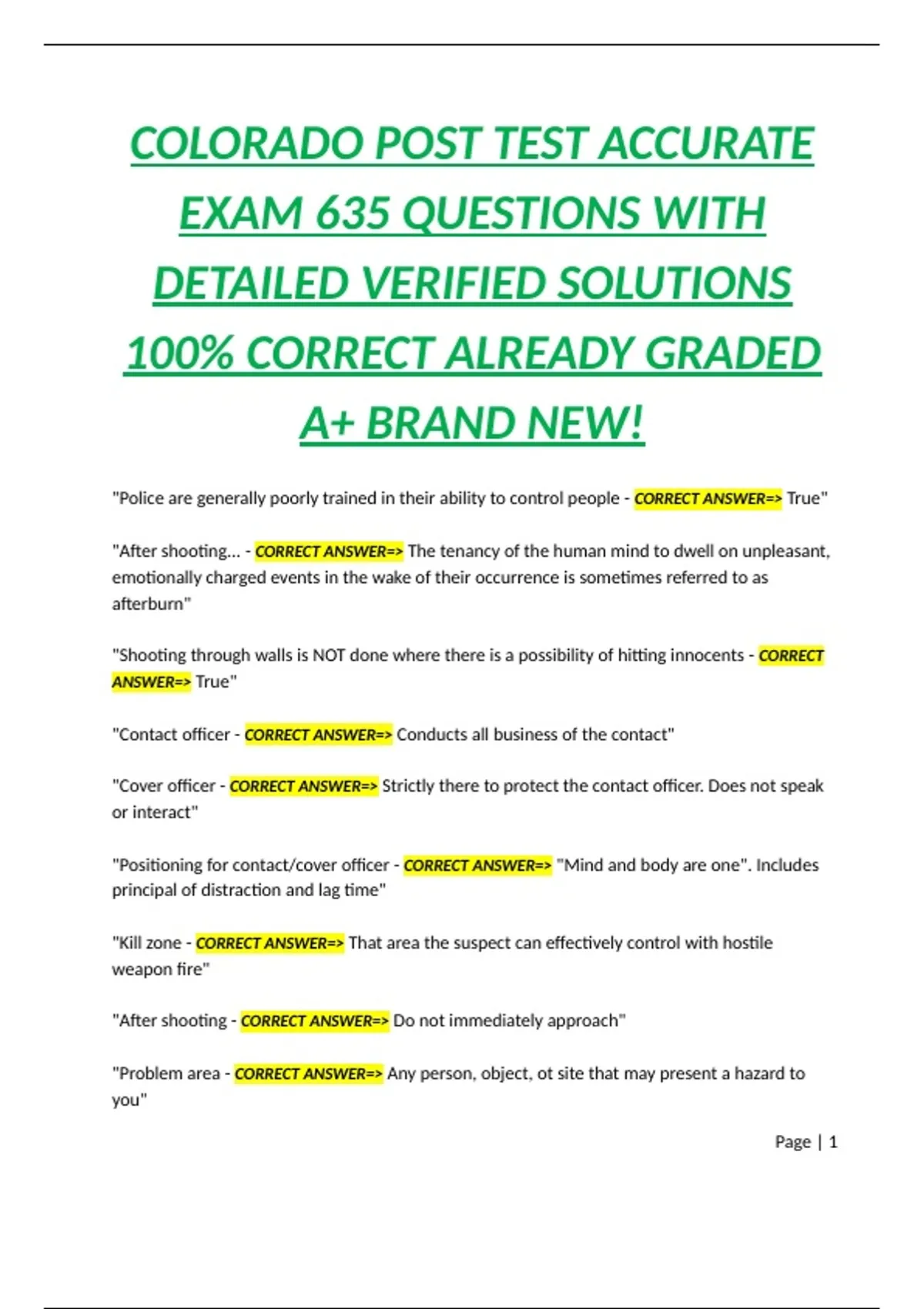 COLORADO POST TEST ACCURATE EXAM 635 QUESTIONS WITH DETAILED VERIFIED SOLUTIONS 100% CORRECT ALREADY GRADED A+ BRAND NEW!