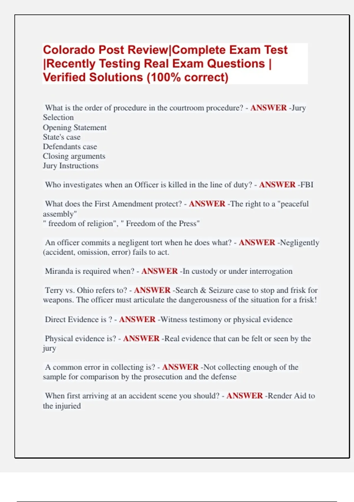 Colorado Post Review|Complete Exam Test |Recently Testing Real Exam Questions | Verified Solutions (100% correct)