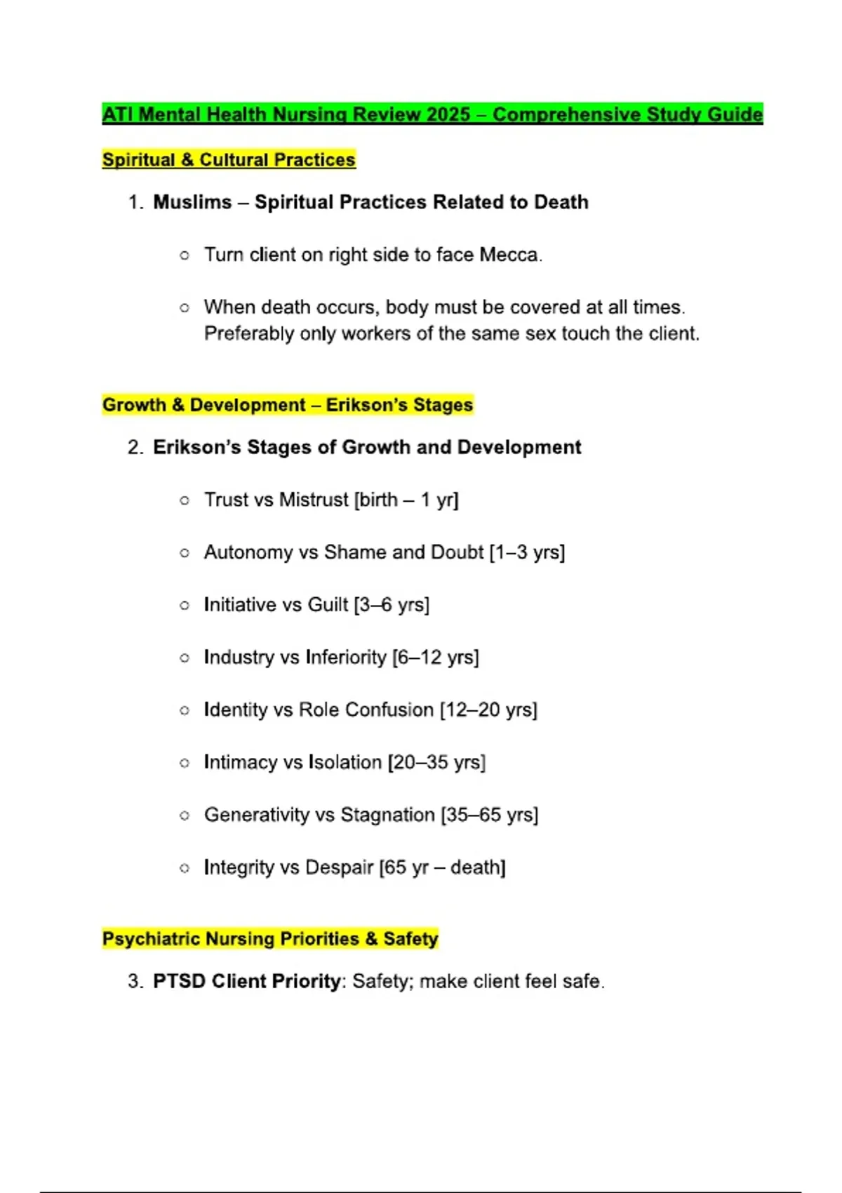 This comprehensive 2025 study guide is designed for ATI Mental Health Nursing exam preparation. Covers psychiatric disorders, therapeutic communication, patient care, nursing interventions, and NGN-style questions. Perfect for nursing students to review key concepts, reinforce knowledge, and boost exam confidence.