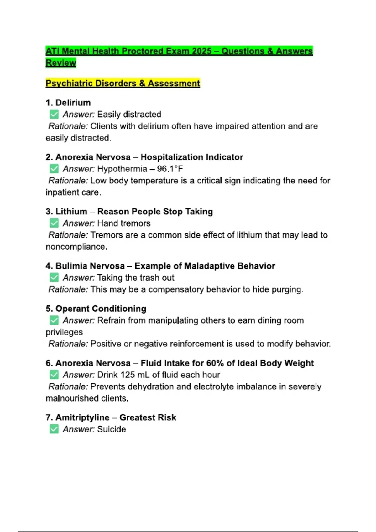 Prepare for the 2025 ATI Mental Health proctored exam with this comprehensive questions and answers review. Covers psychiatric nursing concepts, therapeutic communication, patient care, and NGN-style questions to reinforce knowledge and boost exam readiness. Ideal for nursing students seeking targeted practice.