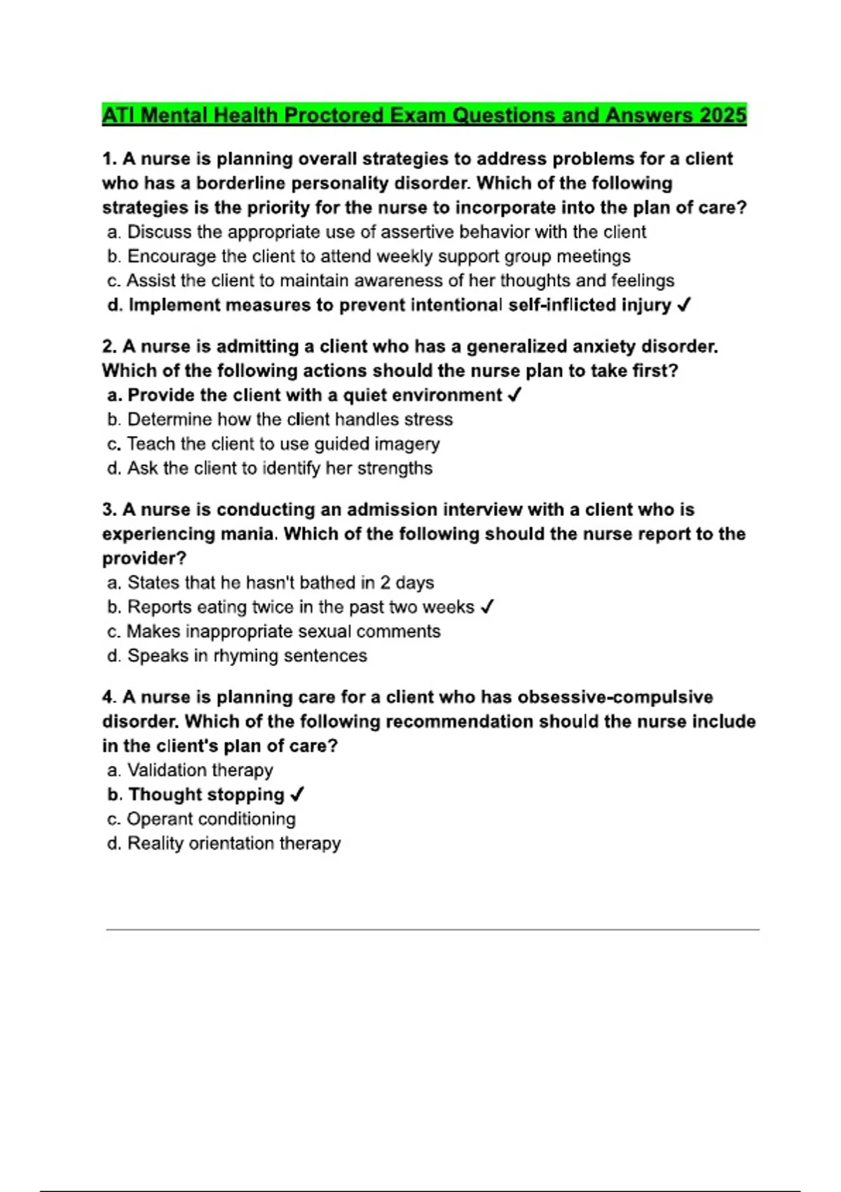 Prepare for the 2025 ATI Mental Health Proctored Exam with this comprehensive set of questions and answers. Includes NGN-style practice, psychiatric nursing concepts, therapeutic communication, patient care, and nursing interventions to reinforce knowledge and boost exam readiness.