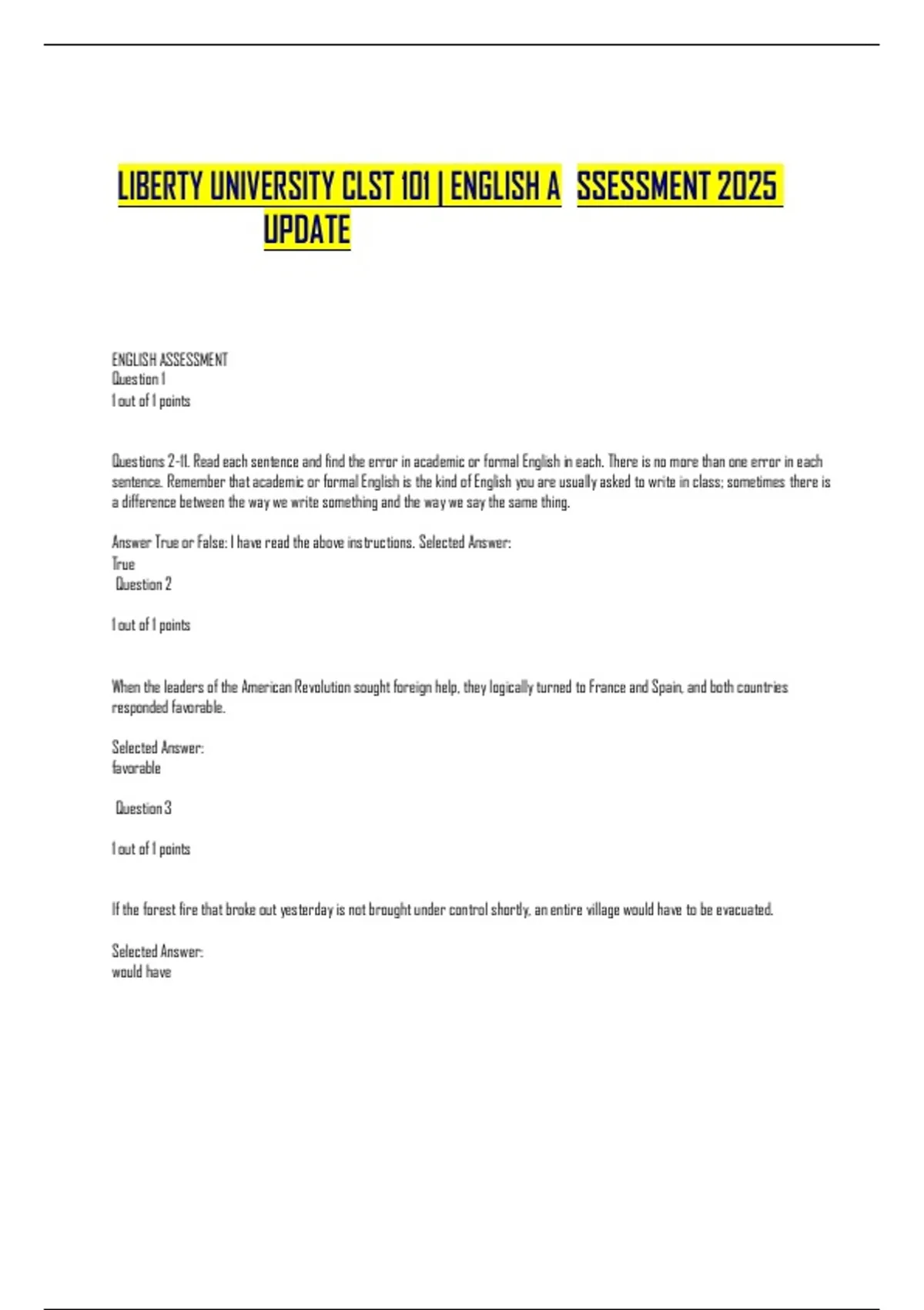 LIBERTY UNIVERSITY CLST 101 | ENGLISH A SSESSMENT 2025 UPDATE