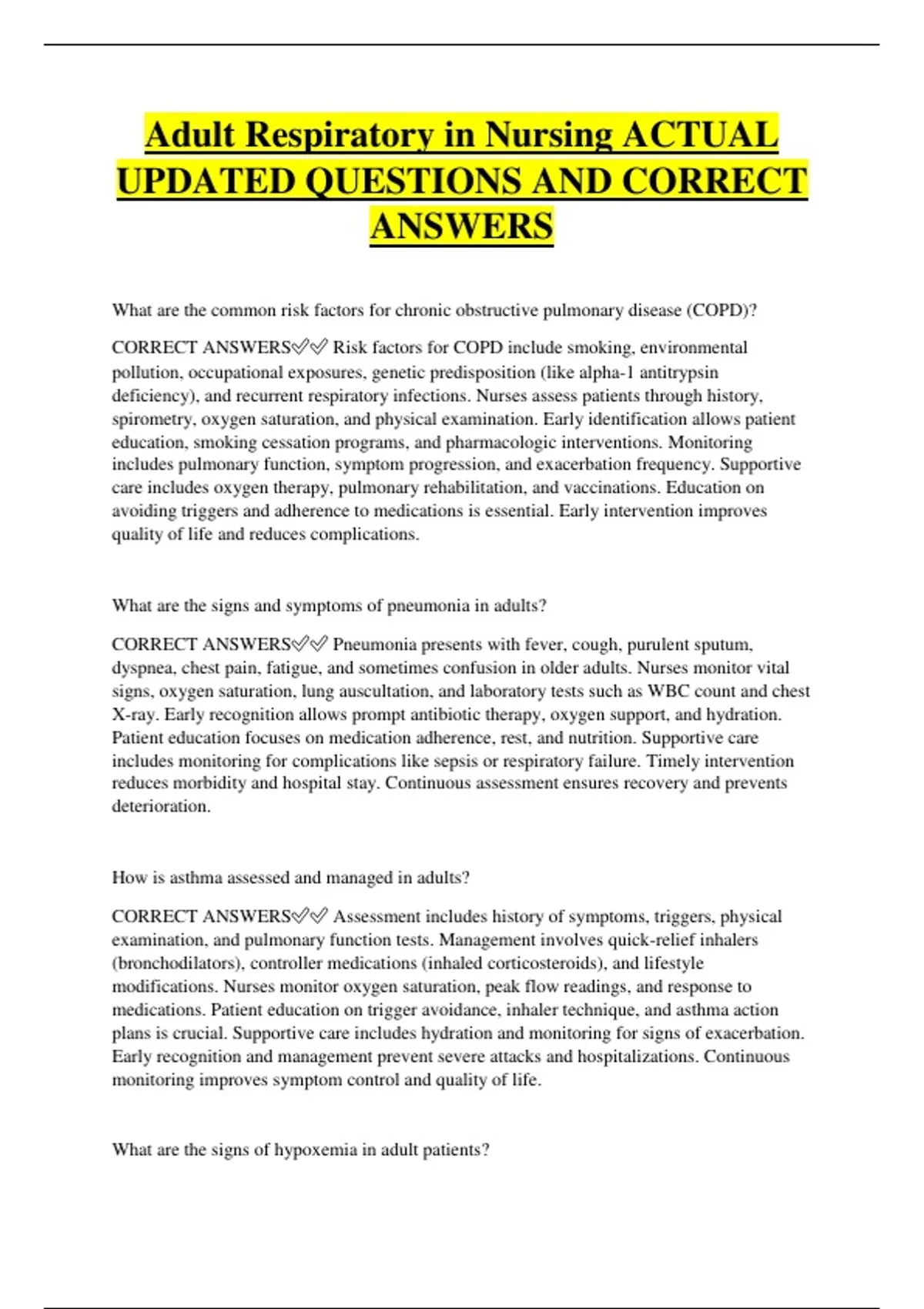 Adult Respiratory in Nursing ACTUAL UPDATED QUESTIONS AND CORRECT ANSWERS What are the common risk factors for chronic obstructive pulmonary disease (COPD)? CORRECT ANSWERS Risk factors for COPD include smoking, environmental pollution, occupational exposures, genetic predisposition (like alpha-1 antitrypsin deficiency), and recurrent respiratory infections. Nurses assess patients through history, spirometry, oxygen saturation, and physical examination. Early identification allows patient education, smoking cessation programs, and pharmacologic interventions. Monitoring includes pulmonary function, symptom progression, and exacerbation frequency. Supportive care includes oxygen therapy, pulmonary rehabilitation, and vaccinations. Education on avoiding triggers and adherence to medications is essential. Early intervention improves quality of life and reduces complications. What are the signs and symptoms of pneumonia in adults? CORRECT ANSWERS Pneumonia presents with fever, cough, purulent sputum, dyspnea, chest pain, fatigue, and sometimes confusion in older adults. Nurses monitor vital signs, oxygen saturation, lung auscultation, and laboratory tests such as WBC count and chest X-ray. Early recognition allows prompt antibiotic therapy, oxygen support, and hydration. Patient education focuses on medication adherence, rest, and nutrition. Supportive care includes monitoring for complications like sepsis or respiratory failure. Timely intervention reduces morbidity and hospital stay. Continuous assessment ensures recovery and prevents deterioration. How is asthma assessed and managed in adults? CORRECT ANSWERS Assessment includes history of symptoms, triggers, physical examination, and pulmonary function tests. Management involves quick-relief inhalers (bronchodilators), controller medications (inhaled corticosteroids), and lifestyle modifications. Nurses monitor oxygen saturation, peak flow readings, and response to medications. Patient education on trigger avoidance, inhaler technique, and asthma action plans is crucial. Supportive care includes hydration and monitoring for signs of exacerbation. Early recognition and management prevent severe attacks and hospitalizations. Continuous monitoring improves symptom control and quality of life. What are the signs of hypoxemia in adult patients? CORRECT ANSWERS Hypoxemia presents with dyspnea, tachypnea, cyanosis, confusion, restlessness, tachycardia, and diaphoresis. Nurses monitor oxygen saturation, arterial blood gases, vital signs, and respiratory effort. Early recognition allows oxygen therapy, medication adjustments, and treatment of underlying causes. Patient education includes recognizing early signs and seeking prompt care. Supportive care involves positioning for optimal ventilation and monitoring for complications. Timely intervention prevents organ dysfunction and respiratory failure. Continuous assessment ensures adequate oxygenation and patient safety. How is adult acute respiratory distress syndrome (ARDS) managed? CORRECT ANSWERS ARDS management includes mechanical ventilation with low tidal volumes, oxygen therapy, fluid management, and treatment of underlying causes. Nurses monitor vital signs, oxygen saturation, arterial blood gases, and respiratory mechanics. Supportive care includes sedation, nutrition, and preventing ventilator-a