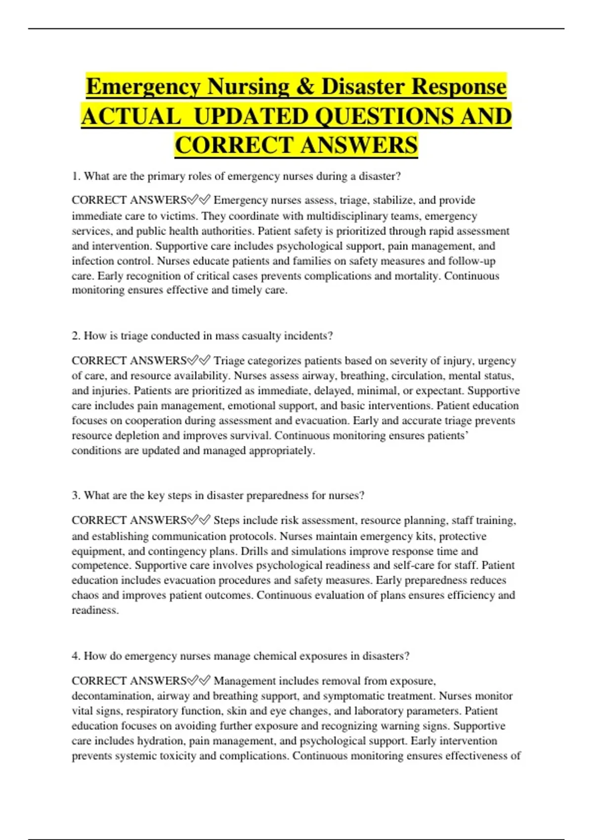 Emergency Nursing & Disaster Response ACTUAL UPDATED QUESTIONS AND CORRECT ANSWERS 1. What are the primary roles of emergency nurses during a disaster? CORRECT ANSWERS Emergency nurses assess, triage, stabilize, and provide immediate care to victims. They coordinate with multidisciplinary teams, emergency services, and public health authorities. Patient safety is prioritized through rapid assessment and intervention. Supportive care includes psychological support, pain management, and infection control. Nurses educate patients and families on safety measures and follow-up care. Early recognition of critical cases prevents complications and mortality. Continuous monitoring ensures effective and timely care. 2. How is triage conducted in mass casualty incidents? CORRECT ANSWERS Triage categorizes patients based on severity of injury, urgency of care, and resource availability. Nurses assess airway, breathing, circulation, mental status, and injuries. Patients are prioritized as immediate, delayed, minimal, or expectant. Supportive care includes pain management, emotional support, and basic interventions. Patient education focuses on cooperation during assessment and evacuation. Early and accurate triage prevents resource depletion and improves survival. Continuous monitoring ensures patients’ conditions are updated and managed appropriately. 3. What are the key steps in disaster preparedness for nurses? CORRECT ANSWERS Steps include risk assessment, resource planning, staff training, and establishing communication protocols. Nurses maintain emergency kits, protective equipment, and contingency plans. Drills and simulations improve response time and competence. Supportive care involves psychological readiness and self-care for staff. Patient education includes evacuation procedures and safety measures. Early preparedness reduces chaos and improves patient outcomes. Continuous evaluation of plans ensures efficiency and readiness. 4. How do emergency nurses manage chemical exposures in disasters? CORRECT ANSWERS Management includes removal from exposure, decontamination, airway and breathing support, and symptomatic treatment. Nurses monitor vital signs, respiratory function, skin and eye changes, and laboratory parameters. Patient education focuses on avoiding further exposure and recognizing warning signs. Supportive care includes hydration, pain management, and psychological support. Early intervention prevents systemic toxicity and complications. Continuous monitoring ensures effectiveness of treatment and safety. Collaboration with toxicology and emergency services ensures optimal outcomes. 5. What is the role of emergency nurses in biological disasters? CORRECT ANSWERS Nurses identify signs and symptoms of infection, isolate affected individuals, and implement infection control protocols. They monitor vital signs, lab tests, and disease progression. Management includes medication administration, supportive care, and coordination with public health authorities. Patient education focuses on prevention, hygiene, and early reporting. Supportive care includes hydration, nutrition, pain management, and psychological support. Early recognition reduces transmission and improves survival. Continuous monitoring ensures patient safety and effective interventions.
