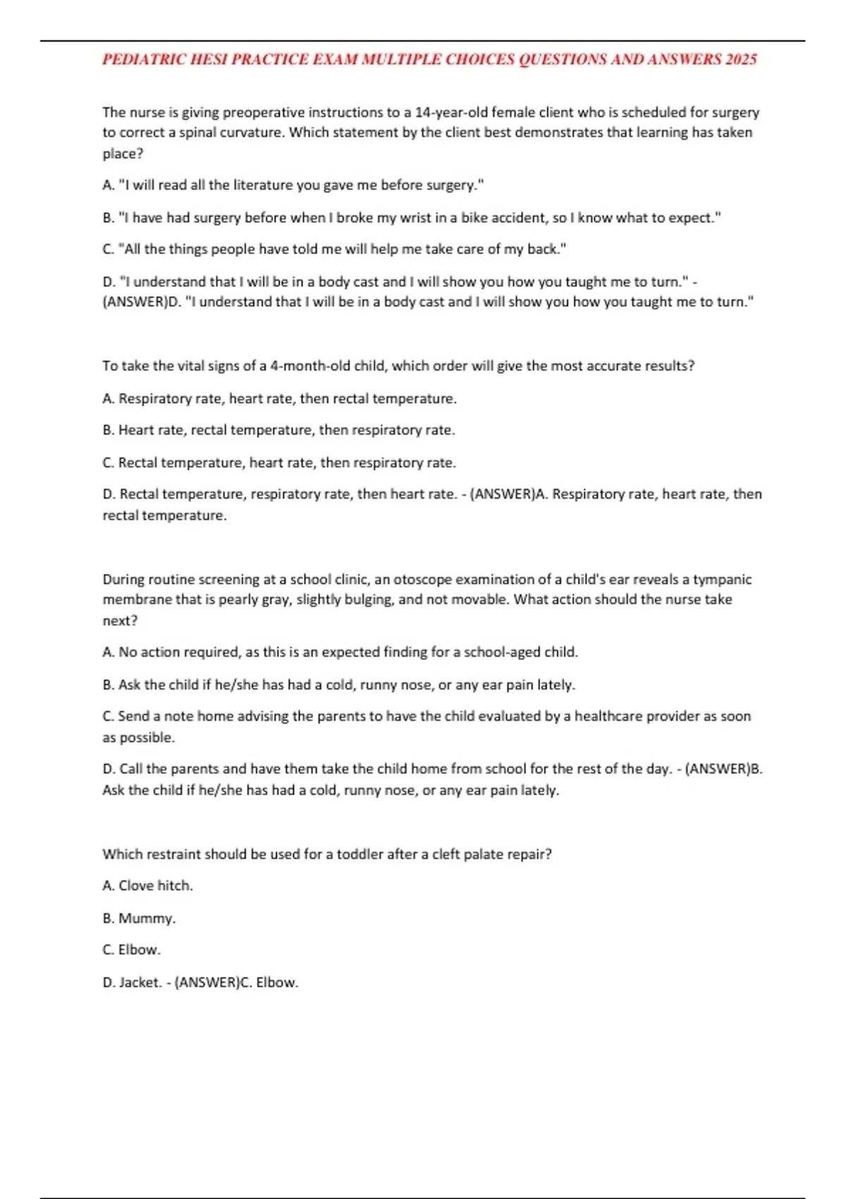 PEDIATRIC HESI PRACTICE EXAM MULTIPLE CHOICES QUESTIONS AND ANSWERS 2025