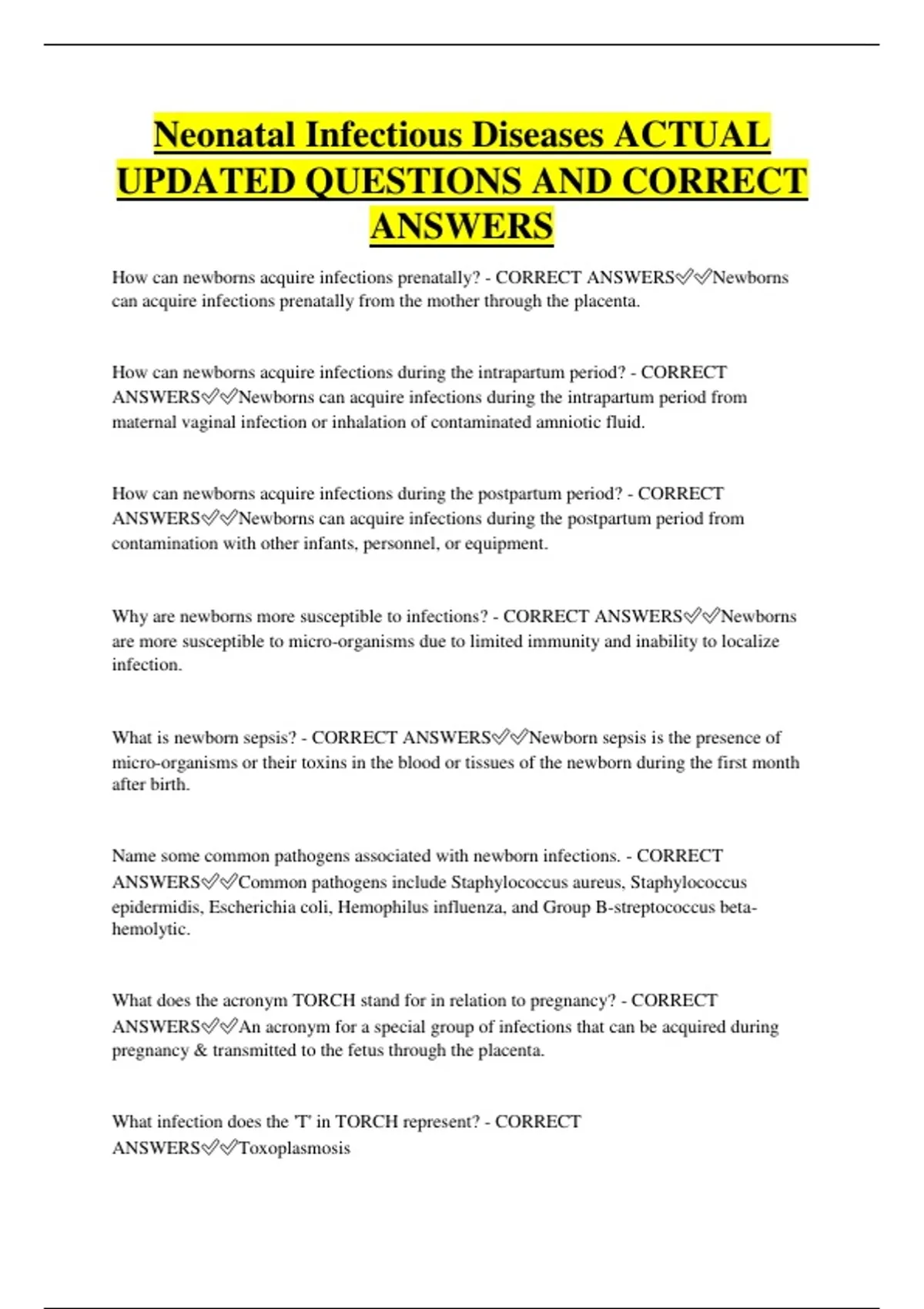ANSWERS✅✅Newborns can acquire infections during the postpartum period from