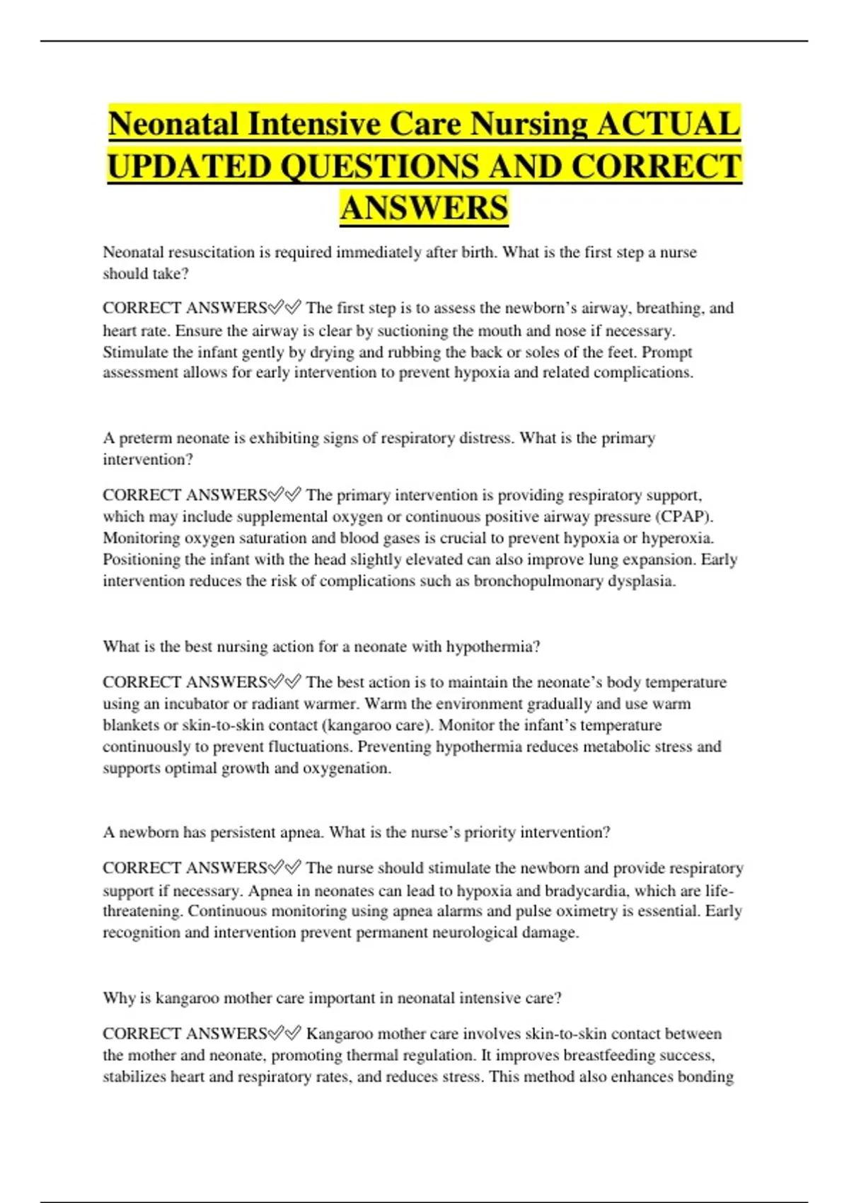 Neonatal Intensive Care Nursing ACTUAL UPDATED QUESTIONS AND CORRECT ANSWERS Neonatal resuscitation is required immediately after birth. What is the first step a nurse should take? CORRECT ANSWERS The first step is to assess the newborn’s airway, breathing, and heart rate. Ensure the airway is clear by suctioning the mouth and nose if necessary. Stimulate the infant gently by drying and rubbing the back or soles of the feet. Prompt assessment allows for early intervention to prevent hypoxia and related complications. A preterm neonate is exhibiting signs of respiratory distress. What is the primary intervention? CORRECT ANSWERS The primary intervention is providing respiratory support, which may include supplemental oxygen or continuous positive airway pressure (CPAP). Monitoring oxygen saturation and blood gases is crucial to prevent hypoxia or hyperoxia. Positioning the infant with the head slightly elevated can also improve lung expansion. Early intervention reduces the risk of complications such as bronchopulmonary dysplasia. What is the best nursing action for a neonate with hypothermia? CORRECT ANSWERS The best action is to maintain the neonate’s body temperature using an incubator or radiant warmer. Warm the environment gradually and use warm blankets or skin-to-skin contact (kangaroo care). Monitor the infant’s temperature continuously to prevent fluctuations. Preventing hypothermia reduces metabolic stress and supports optimal growth and oxygenation. A newborn has persistent apnea. What is the nurse’s priority intervention? CORRECT ANSWERS The nurse should stimulate the newborn and provide respiratory support if necessary. Apnea in neonates can lead to hypoxia and bradycardia, which are life threatening. Continuous monitoring using apnea alarms and pulse oximetry is essential. Early recognition and intervention prevent permanent neurological damage. Why is kangaroo mother care important in neonatal intensive care? CORRECT ANSWERS Kangaroo mother care involves skin-to-skin contact between the mother and neonate, promoting thermal regulation. It improves breastfeeding success, stabilizes heart and respiratory rates, and reduces stress. This method also enhances bonding and neurodevelopmental outcomes. It is especially beneficial for preterm and low birth weight infants. What is the role of the nurse in preventing neonatal infections in the NICU? CORRECT ANSWERS The nurse should practice strict hand hygiene, use sterile techniques, and minimize invasive procedures. Limiting visitors and ensuring proper equipment sterilization are also critical. Monitoring for early signs of infection allows prompt treatment. Prevention of infection is vital as neonates have immature immune systems and are highly vulnerable. How should a nurse manage a neonate with jaundice? CORRECT ANSWERS Management involves phototherapy or exchange transfusion depending on bilirubin levels. The nurse should monitor serum bilirubin and hydration status closely. Encourage frequent feeding to promote bilirubin excretion. Proper management prevents bilirubin-induced neurological damage (kernicterus). A preterm neonate requires intravenous nutrition. What are the nursing considerations? CORRECT ANSWERS The nurse should ensure accurate calculation of fluid, electrolyte, and nutrient requirements. Maintain strict aseptic technique to prevent infections related to central lines. Monitor blood glucose, electrolytes, and weight daily. Proper nutrition supports growth, organ function, and overall survival of preterm infants. What is the appropriate nursing intervention for a neonate with patent ductus arteriosu