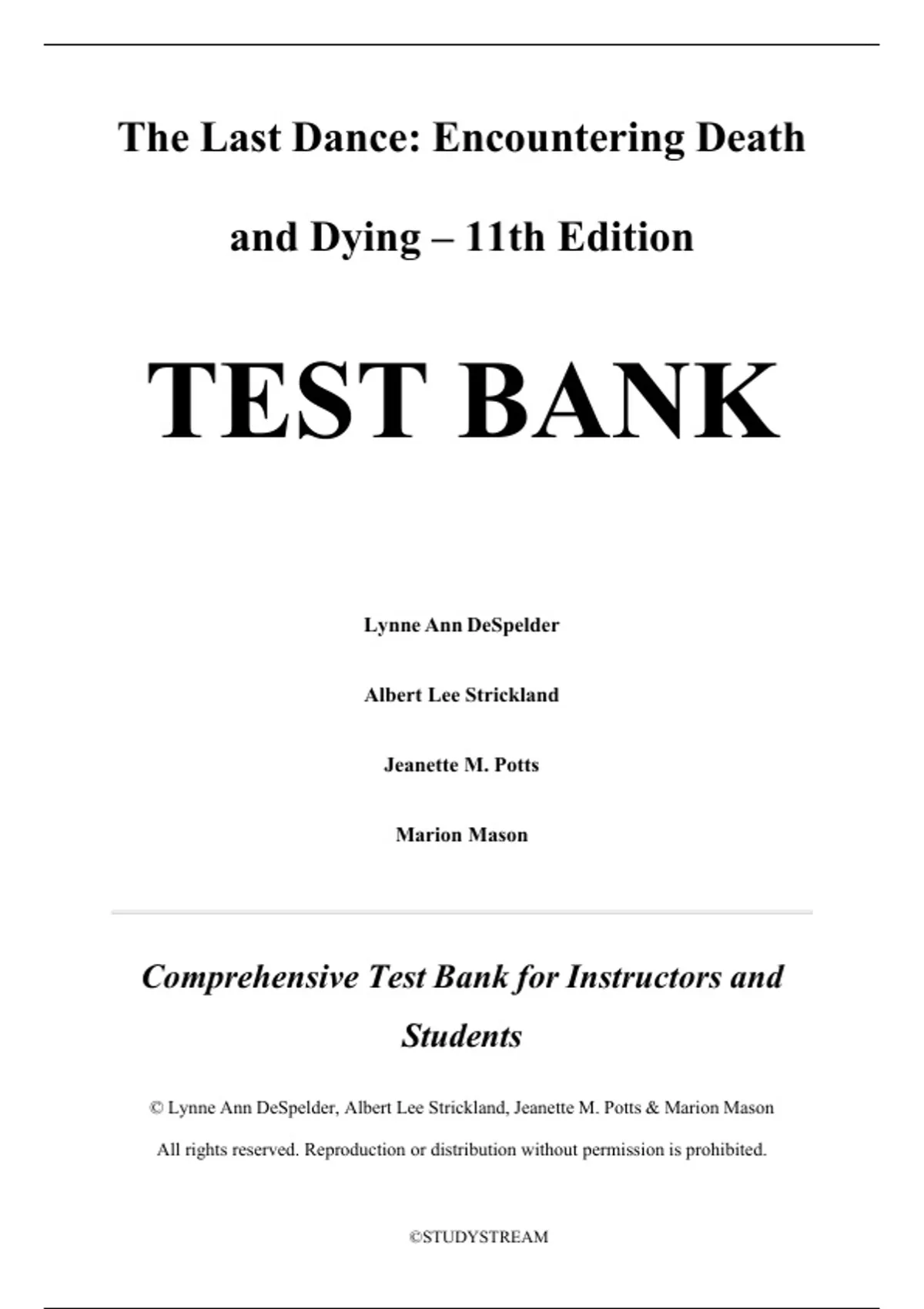 The Test Bank for The Last Dance: Encountering Death and Dying, 11th Edition by Lynne Ann DeSpelder and Albert Lee Strickland delivers a full suite of instructor‑designed assessment items mapped precisely to each chapter in the official McGraw‑Hill edition. This resource includes multiple‑choice, true/false, short‑answer, and applied case or scenario questions, all aligned with the textbook’s learning objectives and teaching framework. It is crafted to support quizzes, midterms, and final exams in courses on thanatology, death studies, grief, and life‑cycle perspectives, enabling instructors to test both conceptual understanding and personal/social application. The test bank covers all 15 chapters of the textbook, in order, as verified on McGraw Hill’s publisher content page: Chapter 1: Attitudes Toward Death: A Climate of Change; Chapter 2: Learning About Death: Socialization; Chapter 3: Perspectives on Death: Historical and Cultural; Chapter 4: Death Systems: Mortality and Society; Chapter 5: Health Care: Patients, Staff, and Institutions; Chapter 6: End-of-Life Issues and Decisions; Chapter 7: Facing Death: Living with Life-Threatening Illness; Chapter 8: Last Rites: Funerals and Body Disposition; Chapter 9: Survivors: Understanding the Experience of Loss; Chapter 10: Death in the Lives of Children and Adolescents; Chapter 11: Death in the Lives of Adults; Chapter 12: Suicide; Chapter 13: Risks, Perils, and Traumatic Death; Chapter 14: Beyond Death / After Life; and Chapter 15: The Path Ahead: Personal and Social Choices.