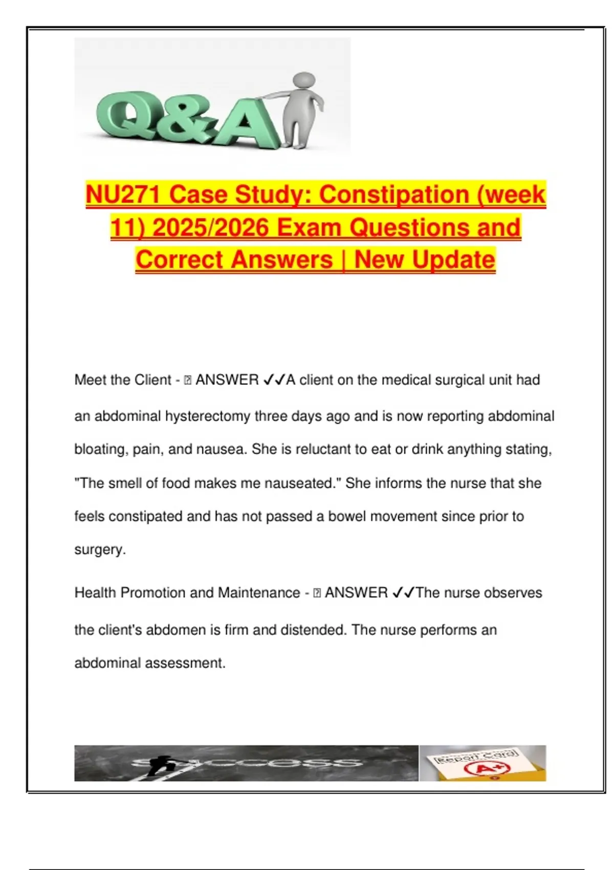 This fully solved NU271 case study explores a postoperative constipation scenario, with NCLEX-aligned Q&A covering nursing assessment, psychosocial integrity, medication administration, and risk management. Designed for the 2025/2026 academic year, the document presents a realistic case involving a client three days post-abdominal hysterectomy who develops abdominal bloating, nausea, and constipation. Key content includes: GI Assessment Sequence: Proper abdominal assessment order (inspection, auscultation, percussion, palpation), interpretation of hypoactive bowel sounds, and identification of peristalsis issues Therapeutic Communication: Strategies for supporting anxious or distressed clients post-surgery using validating and open-ended responses Pharmacological Interventions: Use of bisacodyl suppository and docusate sodium, administration techniques (e.g., Sim's position, relaxation breathing), and documenting outcomes Constipation Management: Fluid intake, early ambulation, effects of opioids like morphine on bowel function, dietary fiber, and education Invasive Procedures & Delegation: Nurse-led rectal exams, vagal nerve response (bradycardia), and appropriate delegation boundaries with UAPs Enema Administration: Managing cramping with clamp control and flow rate, evaluating effectiveness, and client education on fluid measurements (cups/mL conversion) This resource is essential for students in med-surg, fundamentals, pharmacology, or maternal post-op nursing courses, offering critical thinking practice and real-world nursing application. Keywords: postoperative constipation, abdominal assessment, hypoactive bowel sounds, bisacodyl, docusate sodium, digital rectal exam, enema administration, therapeutic communication, Sim's position, opioid side effects, vagal response, fiber intake, fluid measurement conversion, NU271, NCLEX case study, nursing care plan