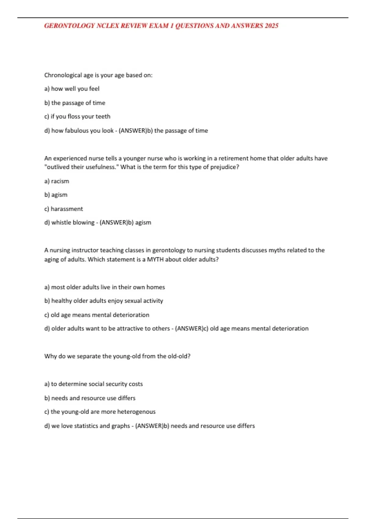 , GERONTOLOGY NCLEX REVIEW EXAM 1 QUESTIONS AND ANSWERS 2025