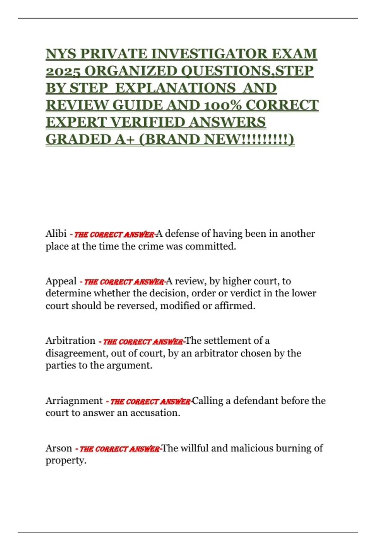 NYS PRIVATE INVESTIGATOR EXAM 2025 ORGANIZED QUESTIONS,STEP BY STEP EXPLANATIONS AND REVIEW GUIDE AND 100% CORRECT EXPERT VERIFIED ANSWERS GRADED A+ (BRAND NEW!!!!!!!!!)