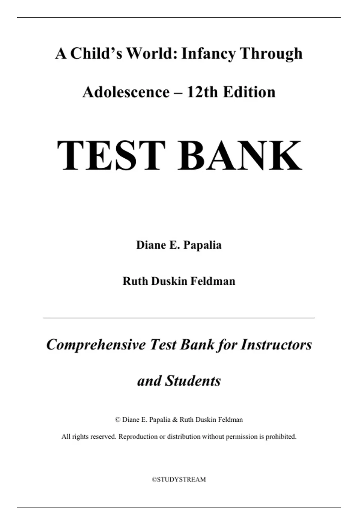, Test Bank for A Child's World Infancy Through Adolescence 12e Diane Papalia