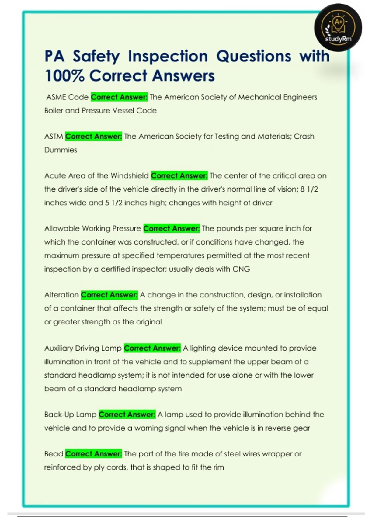 PA Safety Inspection Questions with