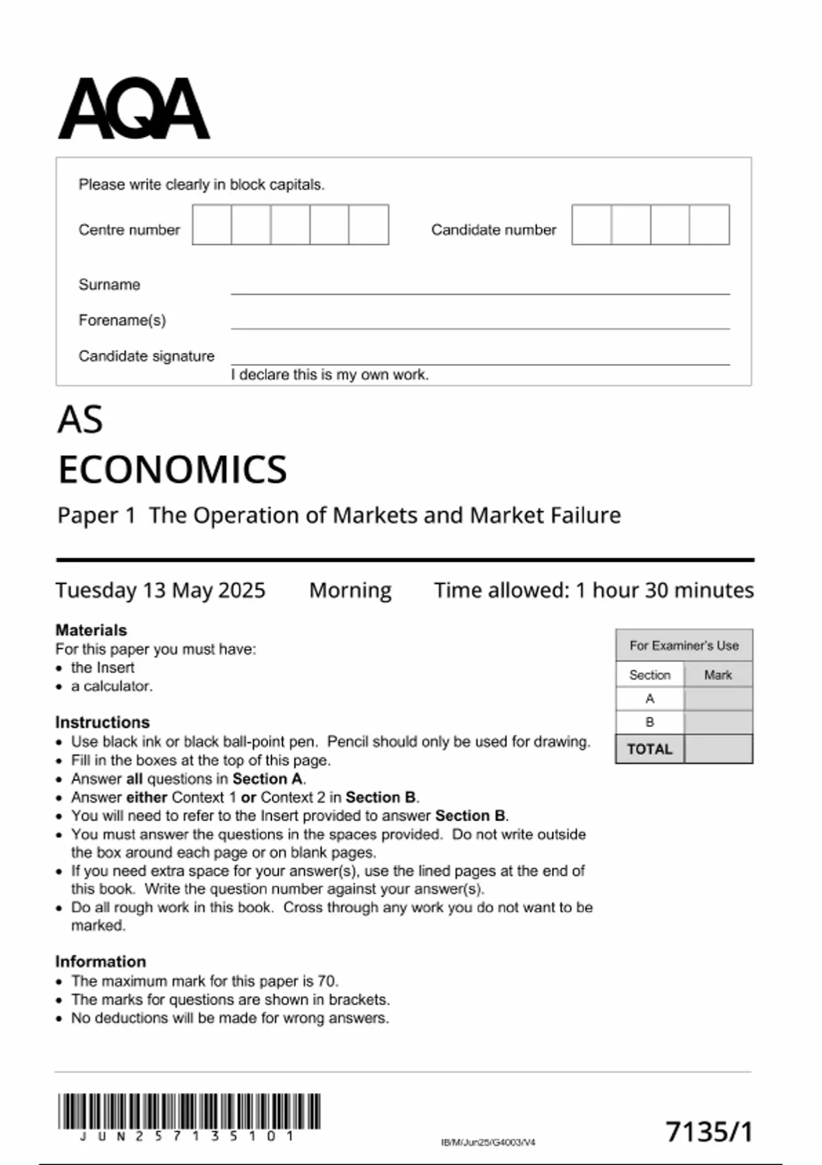 AQA AS ECONOMICS Paper 1 QUESTION PAPER 2025 (7135/1:The Operation of Markets and Market Failure