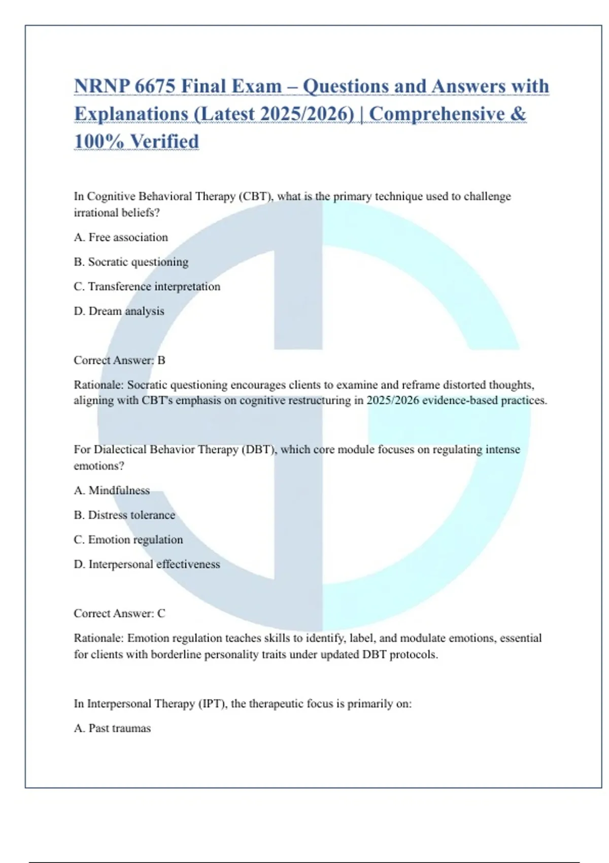 Rationale: Socratic questioning encourages clients to examine and reframe distorted thoughts,