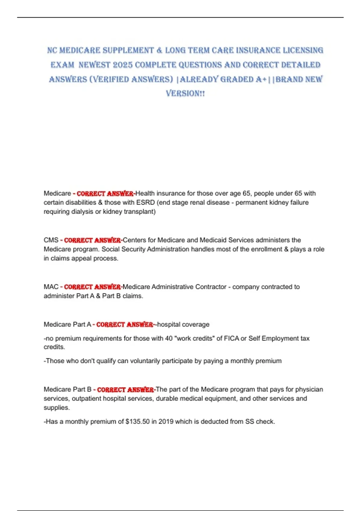 NC MEDICARE SUPPLEMENT & LONG TERM CARE INSURANCE LICENSING EXAM NEWEST 2025 COMPLETE QUESTIONS AND CORRECT DETAILED ANSWERS (VERIFIED ANSWERS) |ALREADY GRADED A+||BRAND NEW VERSION!!