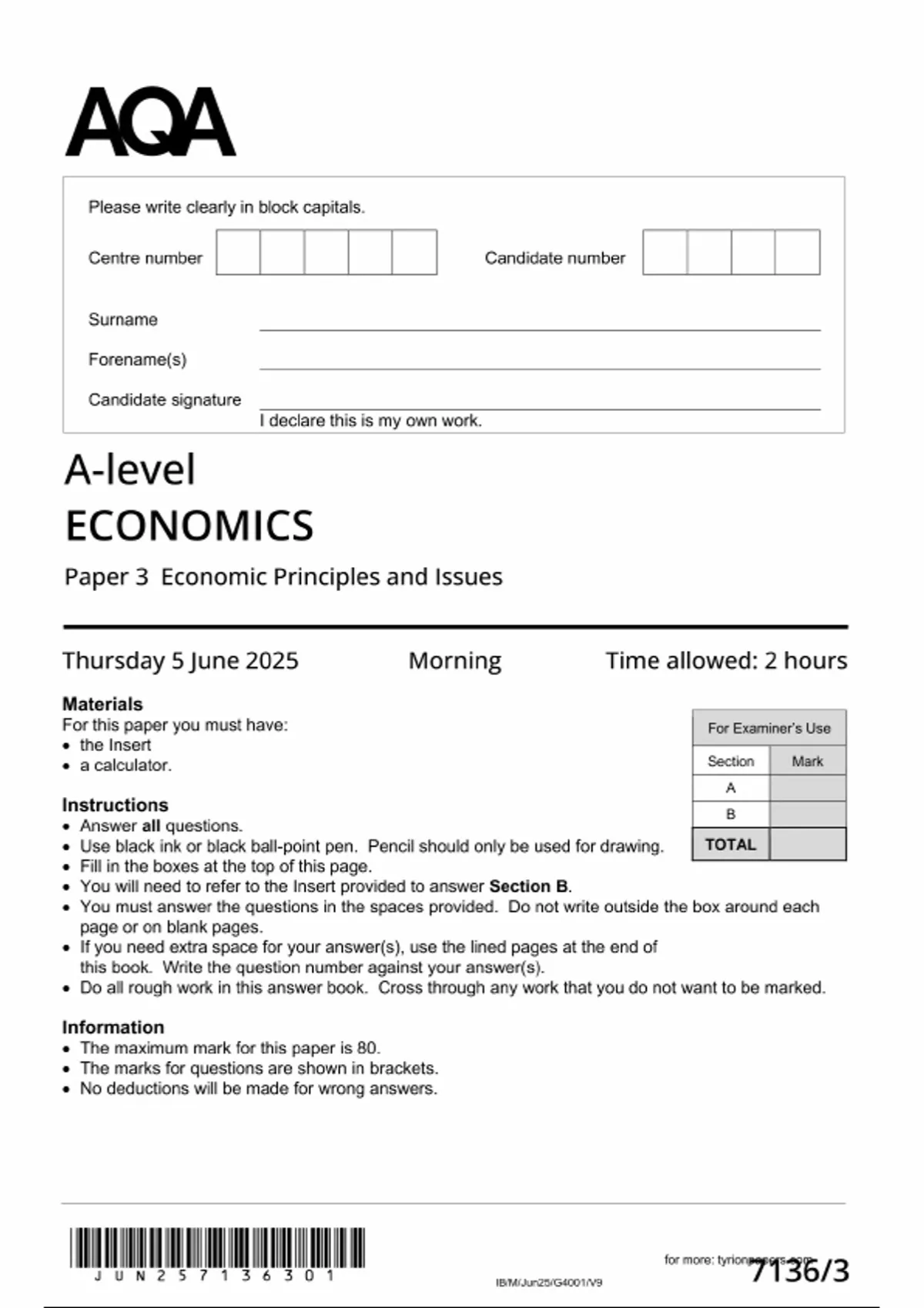 2025 AQA A LEVEL ECONOMICS Paper 3 QUESTION PAPER (7136/3 :Economic Principles and Issues
