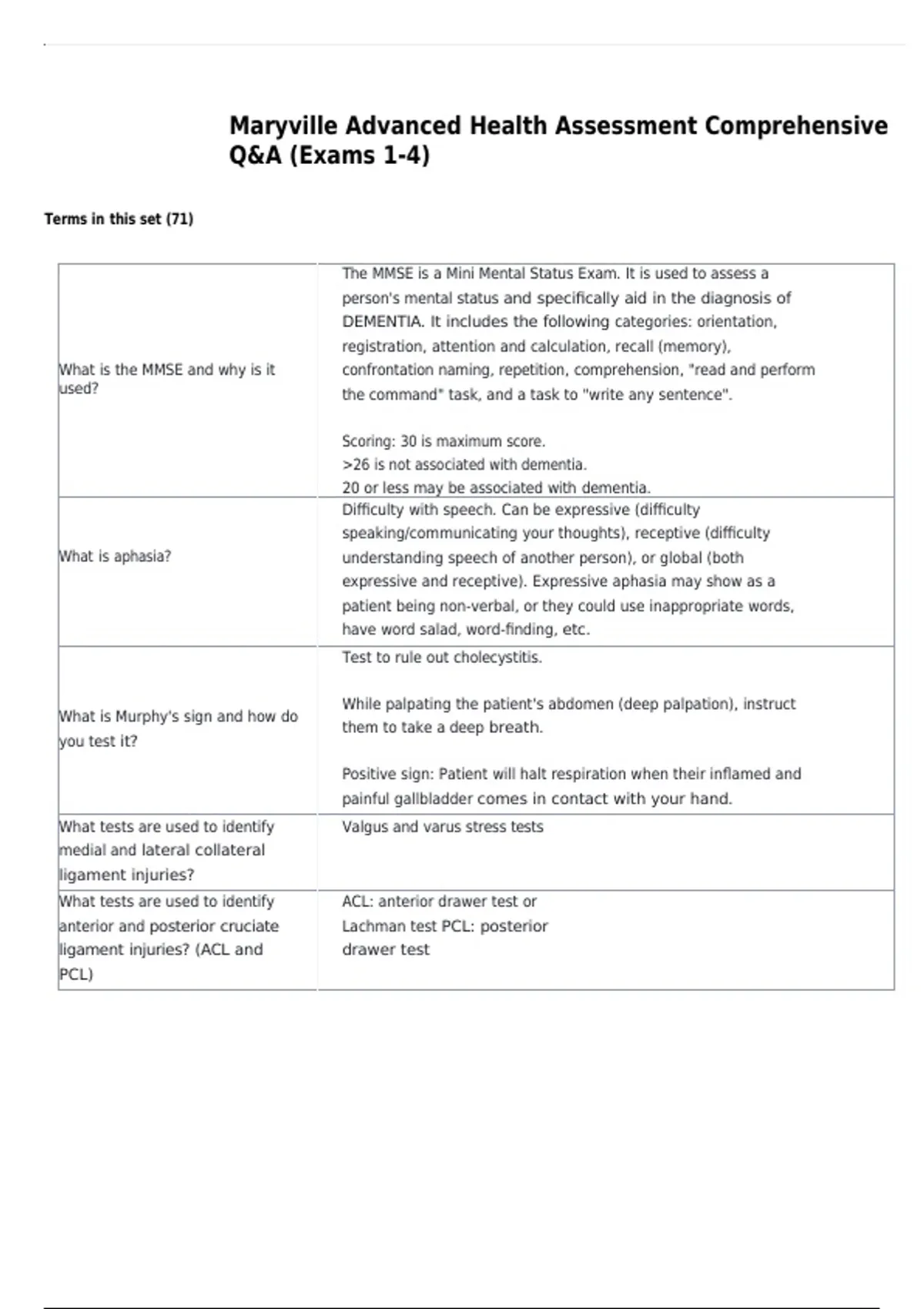Maryville Advanced Health Assessment Comprehensive Q&A (Exams 1-4)