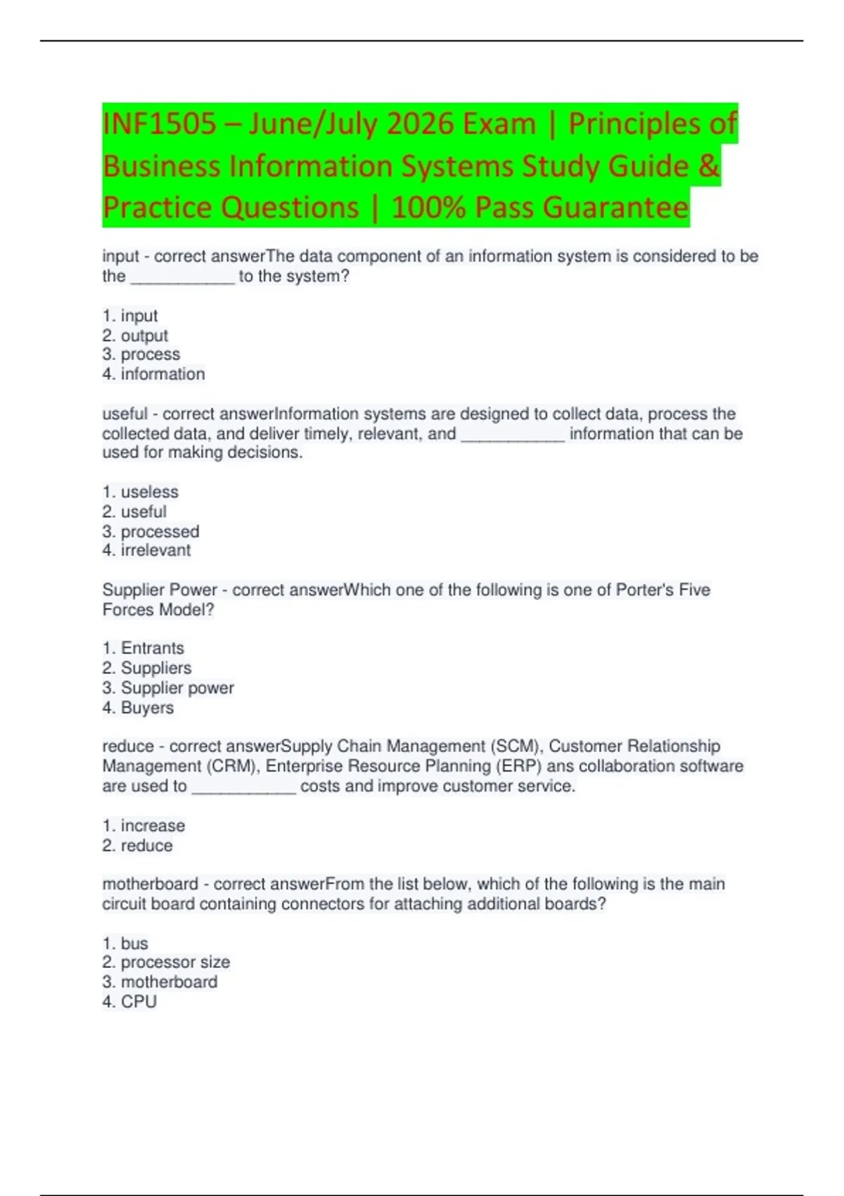Prepare effectively for the INF1505 June/July 2026 Exam with this comprehensive study guide and practice questions. Covers all topics in Principles of Business Information Systems, including system concepts, business processes, data management, and IT applications. Includes verified answers to help students master content, reinforce learning, and confidently achieve a 100% pass rate. Ideal for exam prep, self-study, and classroom use.