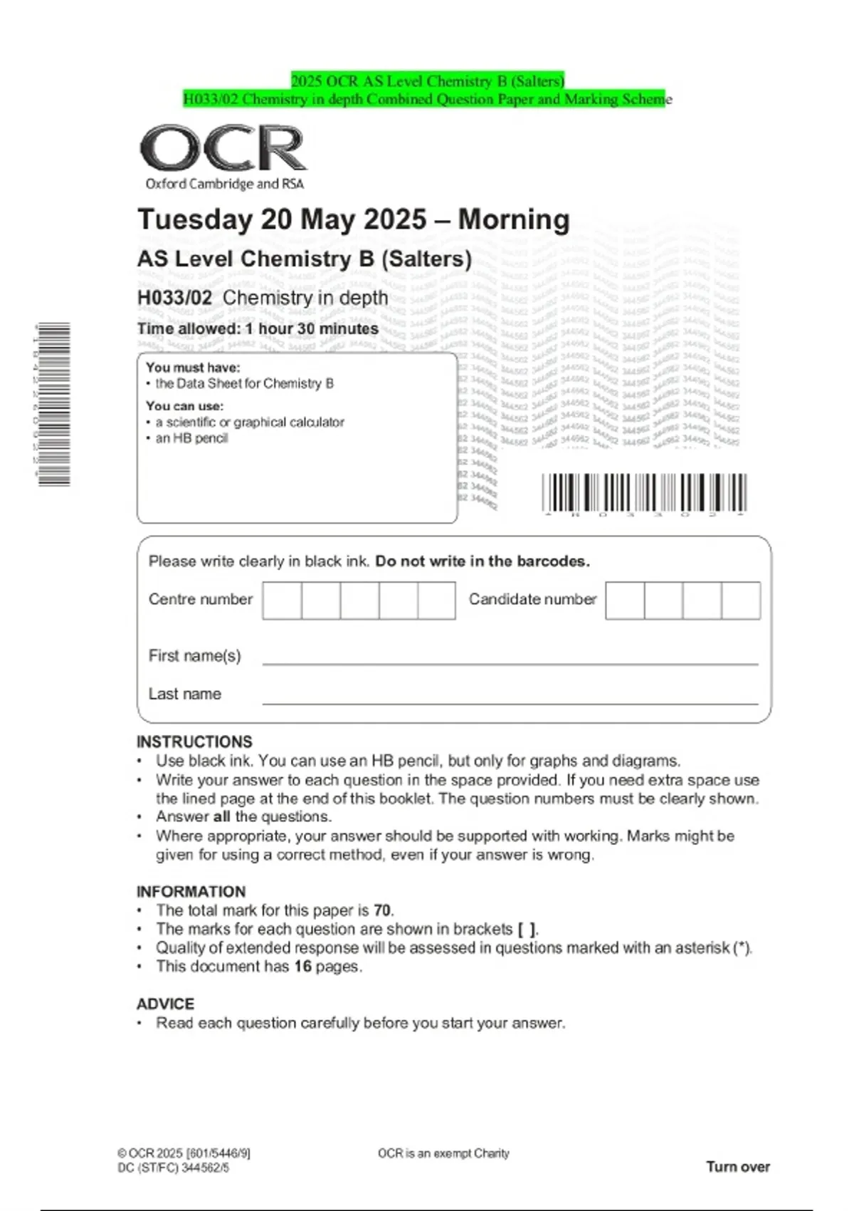 2025 OCR AS Level Chemistry B (Salters) H033/02 Chemistry in depth Combined Question Paper and Marking Scheme