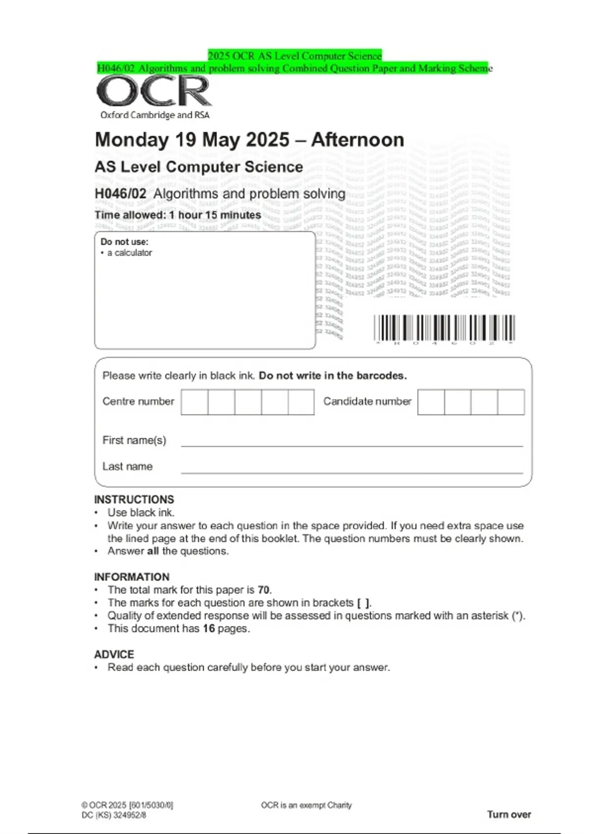 2025 OCR AS Level Computer Science H046/02 Algorithms and problem solving Combined Question Paper and Marking Scheme