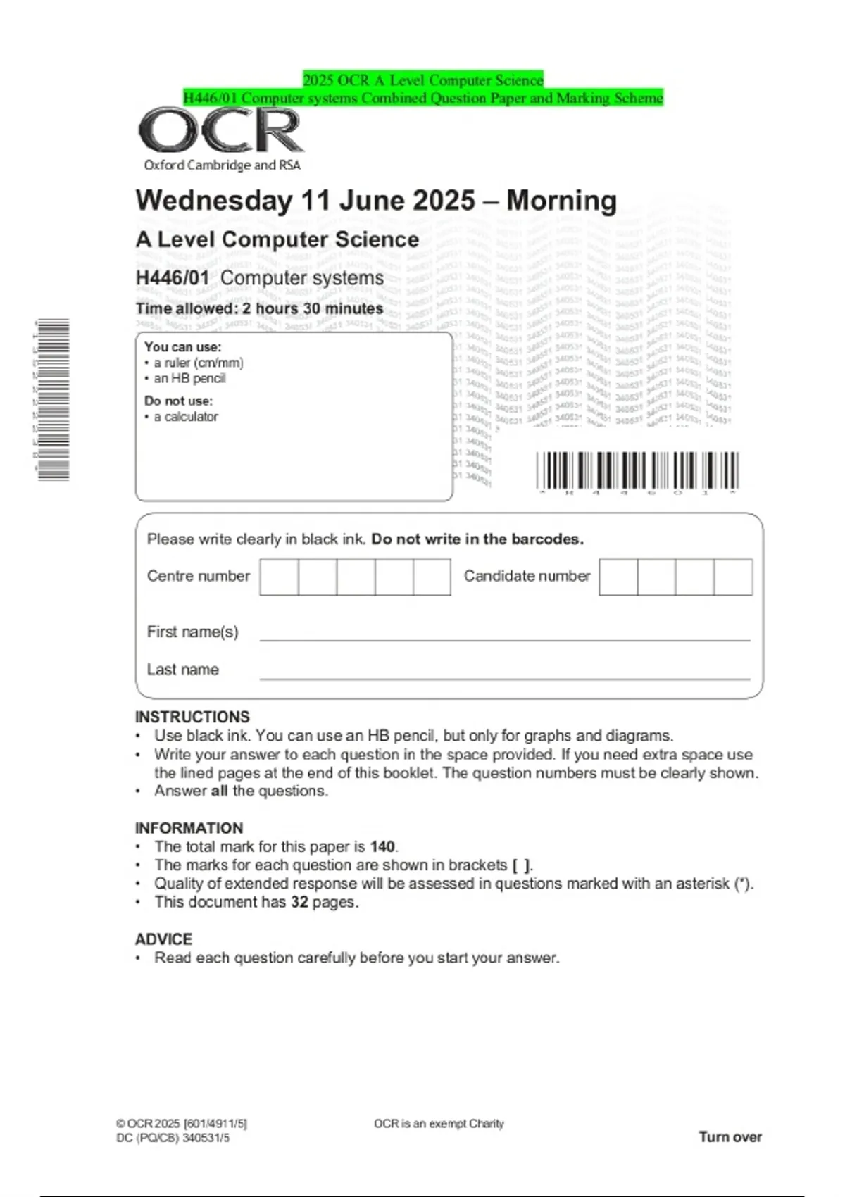 2025 OCR A Level Computer Science H446/01 Computer systems Combined Question Paper and Marking Scheme