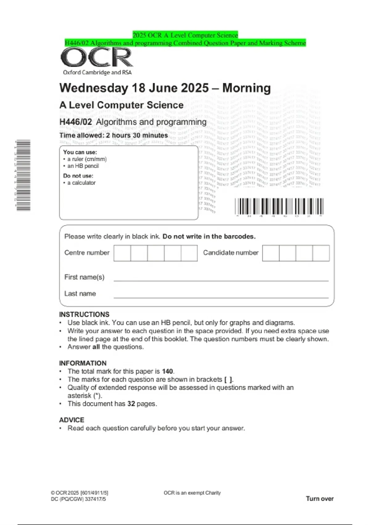 2025 OCR A Level Computer Science H446/02 Algorithms and programming Combined Question Paper and Marking Scheme
