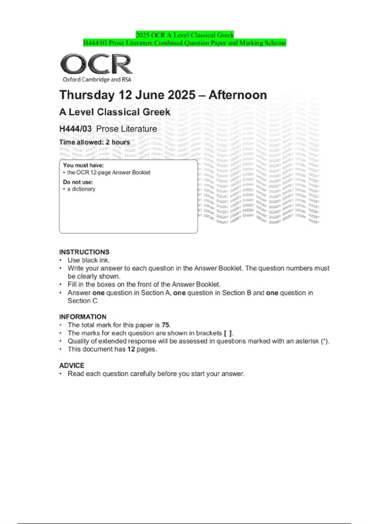 2025 OCR A Level Classical Greek H444/03 Prose Literature Combined Question Paper and Marking Scheme