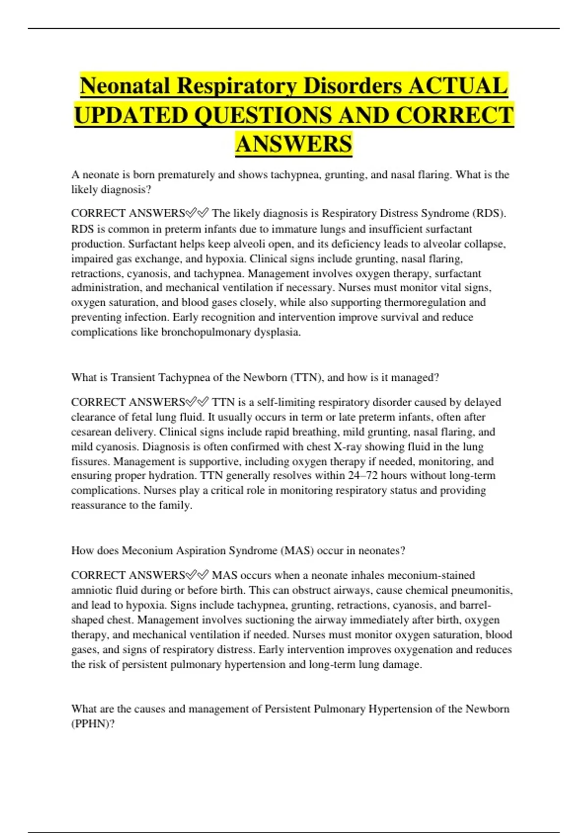 CORRECT ANSWERS✅✅ TTN is a self-limiting respiratory disorder caused by delayed
