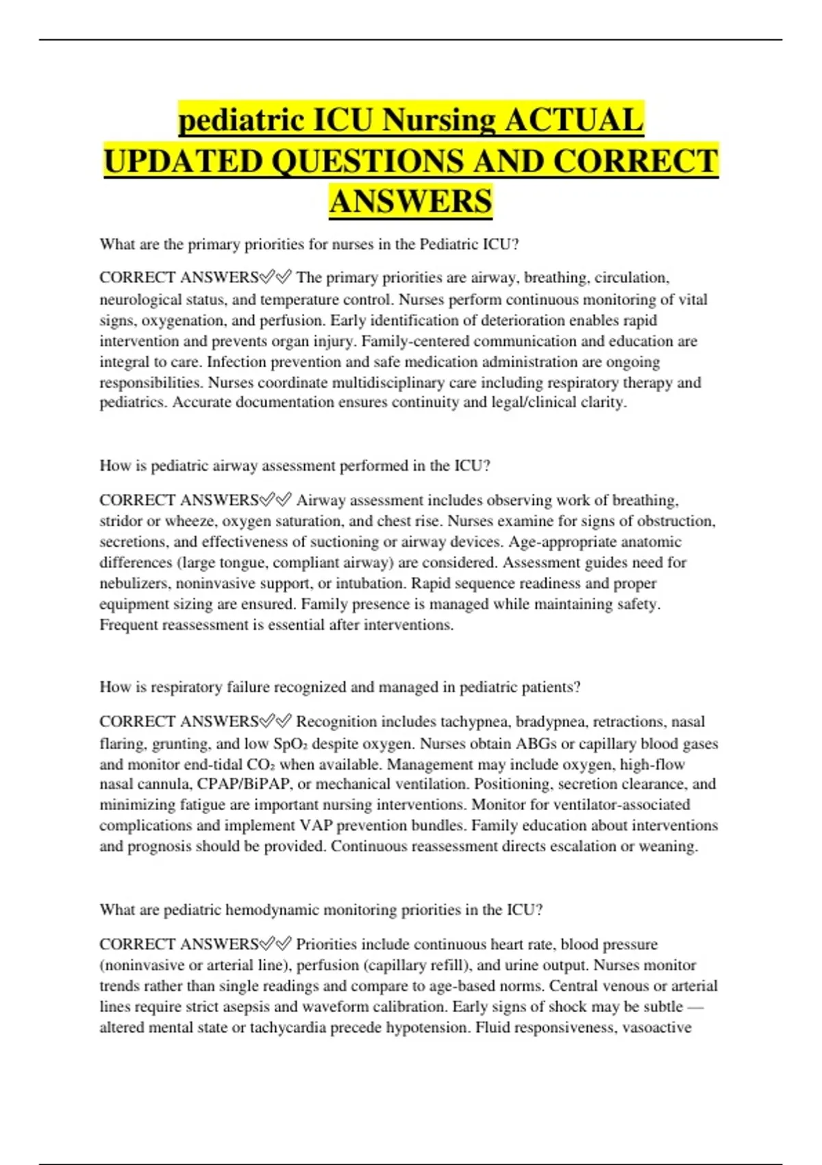 pediatric ICU Nursing ACTUAL UPDATED QUESTIONS AND CORRECT ANSWERS What are the primary priorities for nurses in the Pediatric ICU? CORRECT ANSWERS The primary priorities are airway, breathing, circulation, neurological status, and temperature control. Nurses perform continuous monitoring of vital signs, oxygenation, and perfusion. Early identification of deterioration enables rapid intervention and prevents organ injury. Family-centered communication and education are integral to care. Infection prevention and safe medication administration are ongoing responsibilities. Nurses coordinate multidisciplinary care including respiratory therapy and pediatrics. Accurate documentation ensures continuity and legal/clinical clarity. How is pediatric airway assessment performed in the ICU? CORRECT ANSWERS Airway assessment includes observing work of breathing, stridor or wheeze, oxygen saturation, and chest rise. Nurses examine for signs of obstruction, secretions, and effectiveness of suctioning or airway devices. Age-appropriate anatomic differences (large tongue, compliant airway) are considered. Assessment guides need for nebulizers, noninvasive support, or intubation. Rapid sequence readiness and proper equipment sizing are ensured. Family presence is managed while maintaining safety. Frequent reassessment is essential after interventions. How is respiratory failure recognized and managed in pediatric patients? CORRECT ANSWERS Recognition includes tachypnea, bradypnea, retractions, nasal flaring, grunting, and low SpO₂ despite oxygen. Nurses obtain ABGs or capillary blood gases and monitor end-tidal CO₂ when available. Management may include oxygen, high-flow nasal cannula, CPAP/BiPAP, or mechanical ventilation. Positioning, secretion clearance, and minimizing fatigue are important nursing interventions. Monitor for ventilator-associated complications and implement VAP prevention bundles. Family education about interventions and prognosis should be provided. Continuous reassessment directs escalation or weaning. What are pediatric hemodynamic monitoring priorities in the ICU? CORRECT ANSWERS Priorities include continuous heart rate, blood pressure (noninvasive or arterial line), perfusion (capillary refill), and urine output. Nurses monitor trends rather than single readings and compare to age-based norms. Central venous or arterial lines require strict asepsis and waveform calibration. Early signs of shock may be subtle — altered mental state or tachycardia precede hypotension. Fluid responsiveness, vasoactive support, and lab markers (lactate) guide therapy. Frequent reassessment and clear handoffs ensure stability. Family communication about lines and therapies is maintained. How is pediatric septic shock identified and treated? CORRECT ANSWERS Identification includes fever or hypothermia, tachycardia, delayed capillary refill, altered mental status, and rising lactate. Nurses initiate the sepsis bundle: blood cultures, broad-spectrum antibiotics, and fluid bolus within the first hour. Monitor response to fluids with perfusion, urine output, and hemodynamics; start vasoactive agents if fluid-refractory. Maintain strict infection control and source control mea