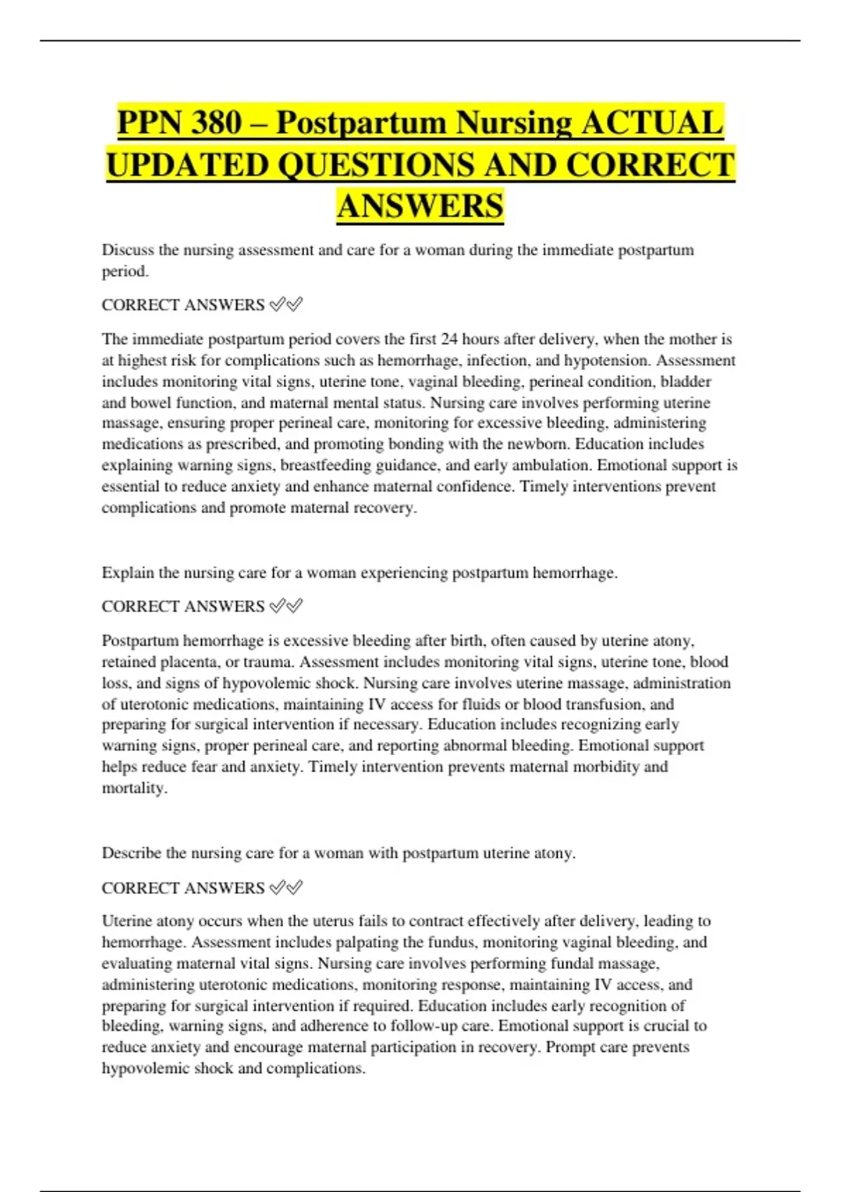 PPN 380 – Postpartum Nursing ACTUAL UPDATED QUESTIONS AND CORRECT ANSWERS Discuss the nursing assessment and care for a woman during the immediate postpartum period. CORRECT ANSWERS The immediate postpartum period covers the first 24 hours after delivery, when the mother is at highest risk for complications such as hemorrhage, infection, and hypotension. Assessment includes monitoring vital signs, uterine tone, vaginal bleeding, perineal condition, bladder and bowel function, and maternal mental status. Nursing care involves performing uterine massage, ensuring proper perineal care, monitoring for excessive bleeding, administering medications as prescribed, and promoting bonding with the newborn. Education includes explaining warning signs, breastfeeding guidance, and early ambulation. Emotional support is essential to reduce anxiety and enhance maternal confidence. Timely interventions prevent complications and promote maternal recovery. Explain the nursing care for a woman experiencing postpartum hemorrhage. CORRECT ANSWERS Postpartum hemorrhage is excessive bleeding after birth, often caused by uterine atony, retained placenta, or trauma. Assessment includes monitoring vital signs, uterine tone, blood loss, and signs of hypovolemic shock. Nursing care involves uterine massage, administration of uterotonic medications, maintaining IV access for fluids or blood transfusion, and preparing for surgical intervention if necessary. Education includes recognizing early warning signs, proper perineal care, and reporting abnormal bleeding. Emotional support helps reduce fear and anxiety. Timely intervention prevents maternal morbidity and mortality. Describe the nursing care for a woman with postpartum uterine atony. CORRECT ANSWERS Uterine atony occurs when the uterus fails to contract effectively after delivery, leading to hemorrhage. Assessment includes palpating the fundus, monitoring vaginal bleeding, and evaluating maternal vital signs. Nursing care involves performing fundal massage, administering uterotonic medications, monitoring response, maintaining IV access, and preparing for surgical intervention if required. Education includes early recognition of bleeding, warning signs, and adherence to follow-up care. Emotional support is crucial to reduce anxiety and encourage maternal participation in recovery. Prompt care prevents hypovolemic shock and complications. Explain the nursing care for a woman with postpartum infection. CORRECT ANSWERS Postpartum infections can involve the uterus (endometritis), perineum, cesarean wound, or urinary tract, presenting with fever, pain, foul-smelling lochia, or dysuria. Assessment includes monitoring temperature, wound/perineal inspection, vital signs, and laboratory tests. Nursing care involves administering prescribed antibiotics, maintaining hygiene, promoting hydration, monitoring for systemic infection, and providing comfort measures. Education includes infection prevention strategies, proper wound care, and recognizing early warning signs. Emotional support reduces anxiety and promotes adherence to treatment. Timely management prevents sepsis and promotes maternal recovery. Describe the nursing care of a woman with postpartum urinary retent