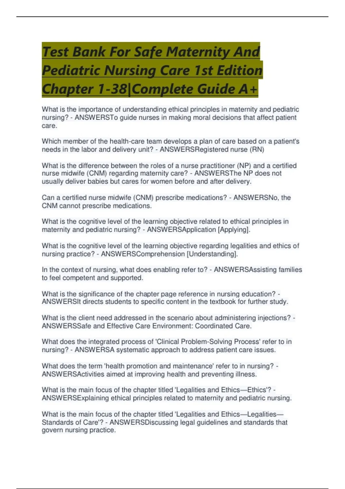 ANSWERSChapter 1: Introduction to Maternity and Pediatric Nursing