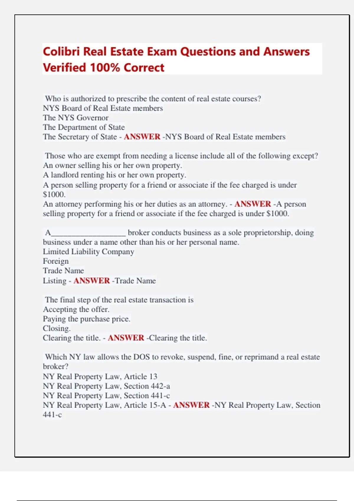 Colibri Real Estate Exam Questions and Answers Verified 100% Correct Who is authorized to prescribe the content of real estate courses? NYS Board of Real Estate members The NYS Governor The Department of State The Secretary of State - ANSWER -NYS Board of Real Estate members Those who are exempt from needing a license include all of the following except? An owner selling his or her own property. A landlord renting his or her own property. A person selling property for a friend or associate if the fee charged is under $1000. An attorney performing his or her duties as an attorney. - ANSWER -A person selling property for a friend or associate if the fee charged is under $1000. A__________________ broker conducts business as a sole proprietorship, doing business under a name other than his or her personal name. Limited Liability Company Foreign Trade Name Listing - ANSWER -Trade Name The final step of the real estate transaction is Accepting the offer. Paying the purchase price. Closing. Clearing the title. - ANSWER -Clearing the title. Which NY law allows the DOS to revoke, suspend, fine, or reprimand a real estate broker? NY Real Property Law, Article 13 NY Real Property Law, Section 442-a NY Real Property Law, Section 441-c NY Real Property Law, Article 15-A - ANSWER -NY Real Property Law, Section 441-c The Broker Exam is a written exam in a multiple-choice format and contains______questions. 200 50 75 100 - ANSWER -100 Who has the duty to administer all licensing provisions of Article 12-A? NYS Board of Real Estate members The NYS Governor The Department of State The Secretary of State - ANSWER -The Secretary of State How many members does the Governor appoint to the Board of Real Estate? 5 brokers and no public members 4 brokers and 3 public members 3 brokers and 4 public members 1 broker and 1 public member - ANSWER -3 brokers and 4 public members Which of the following real estate licenses has a fee of $65? Salesperson Associate Broker Broker Branch Office - ANSWER -Salesperson Which section of New York Real Property Law gives authority to the Department of State to regulate real estate brokers and salespersons? Article 12-A Article 78 Article 12 Article 9-a - ANSWER -Article 12-A New York has established a point system to help determine the experience a Broker candidate needs. A total of_________ points and the equivalent to two years of full-time experience for broker candidates. 2000 2500 3000 3500 - ANSWER -3500 Which of the following licensees can only receive commission payments from his or her sponsoring broker? Broker Salesperson Affiliate Broker Apprentice - ANSWER -Salesperson How will an examinee know what percent of the exam questions he or she ANSWERed correctly? The percentage score will be mailed to the examinee within 15 days of the exam. The percentage score will available online only for those examinees who fail the exam. The percentage score is not given to the examinee. The percentage score will be mailed to the examinee for a $25 fee. - ANSWER The percentage score is not given to the examinee. The final step of the real estate transaction when the buyer gets the deed to the property, the seller gets the proceeds from the sale, and the broker gets his or her commission is called? Settling the transaction. Negotiating the purchase contract. Financing the purchase. Listing the property. - ANSWER -Settling the transaction. How many hours of education is a broker candidate required to complete in addition to those required for a salesperson's license? 75 hours 55 hours 100 hours 120 hours - ANSWER -75 hours Which of the following is NOT one of the real estate broker license types? Salesperson Trade name broker Partnership broker Corporate broker - ANSWER -Salesperson