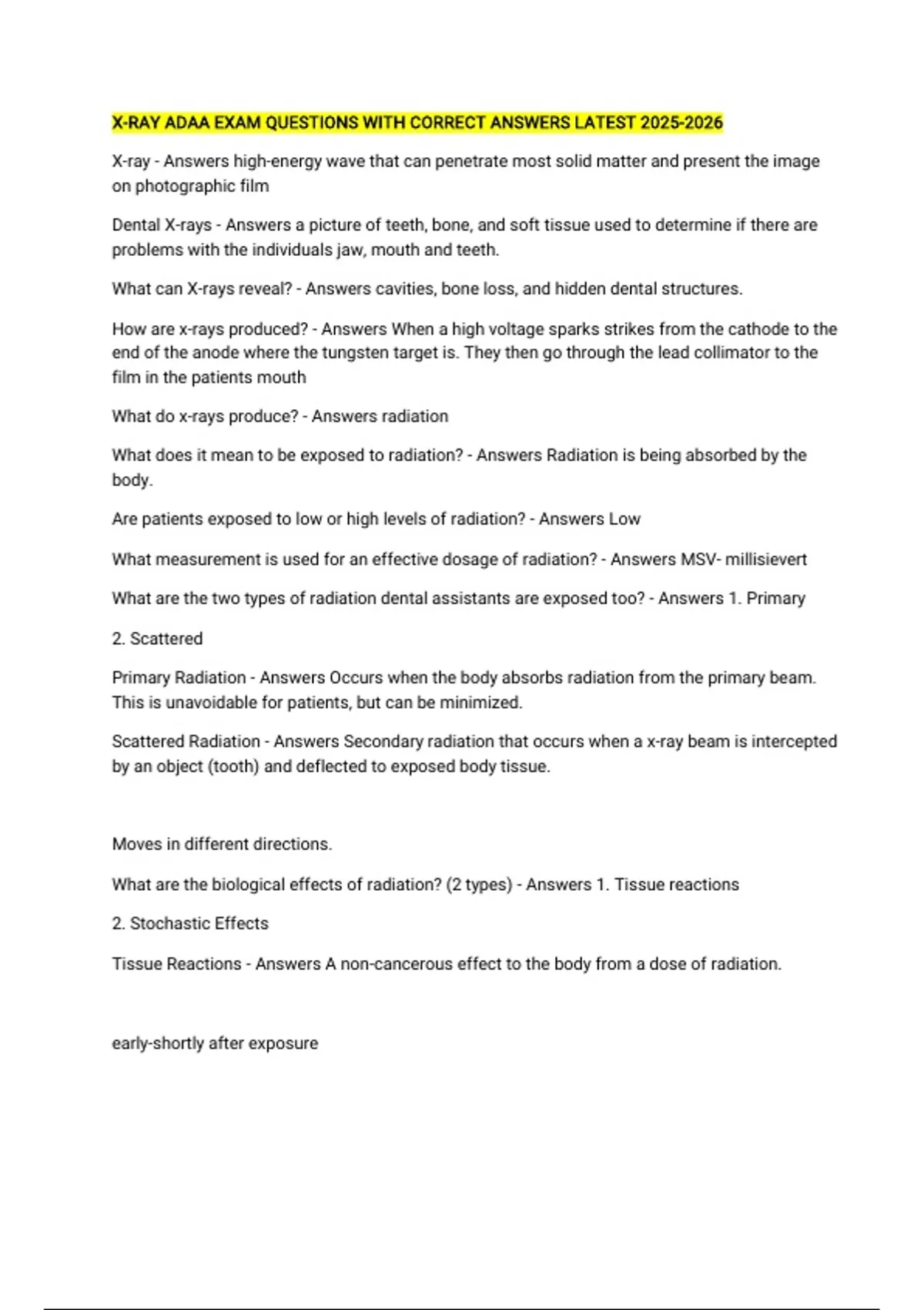 X-RAY ADAA EXAM QUESTIONS WITH CORRECT ANSWERS LATEST X-ray - Answers high-energy wave that can penetrate most solid matter and present the image on photographic film Dental X-rays - Answers a picture of teeth, bone, and soft tissue used to determine if there are problems with the individuals jaw, mouth and teeth. What can X-rays reveal? - Answers cavities, bone loss, and hidden dental structures. How are x-rays produced? - Answers When a high voltage sparks strikes from the cathode to the end of the anode where the tungsten target is. They then go through the lead collimator to the film in the patients mouth What do x-rays produce? - Answers radiation What does it mean to be exposed to radiation? - Answers Radiation is being absorbed by the body. Are patients exposed to low or high levels of radiation? - Answers Low What measurement is used for an effective dosage of radiation? - Answers MSV- millisievert What are the two types of radiation dental assistants are exposed too? - Answers 1. Primary 2. Scattered Primary Radiation - Answers Occurs when the body absorbs radiation from the primary beam. This is unavoidable for patients, but can be minimized. Scattered Radiation - Answers Secondary radiation that occurs when a x-ray beam is intercepted by an object (tooth) and deflected to exposed body tissue. Moves in different directions. What are the biological effects of radiation? (2 types) - Answers 1. Tissue reactions 2. Stochastic Effects Tissue Reactions - Answers A non-cancerous effect to the body from a dose of radiation. early-shortly after exposure Late- months to years after exposure Stochastic effects - Answers Effects that may develop over time due to radiation. This is random and depends on laws of chance. -Cancer -Genetic effects (sperm or egg) Methods used to control exposure to radiation? - Answers 1. Time 2. Distance 3. Shielding