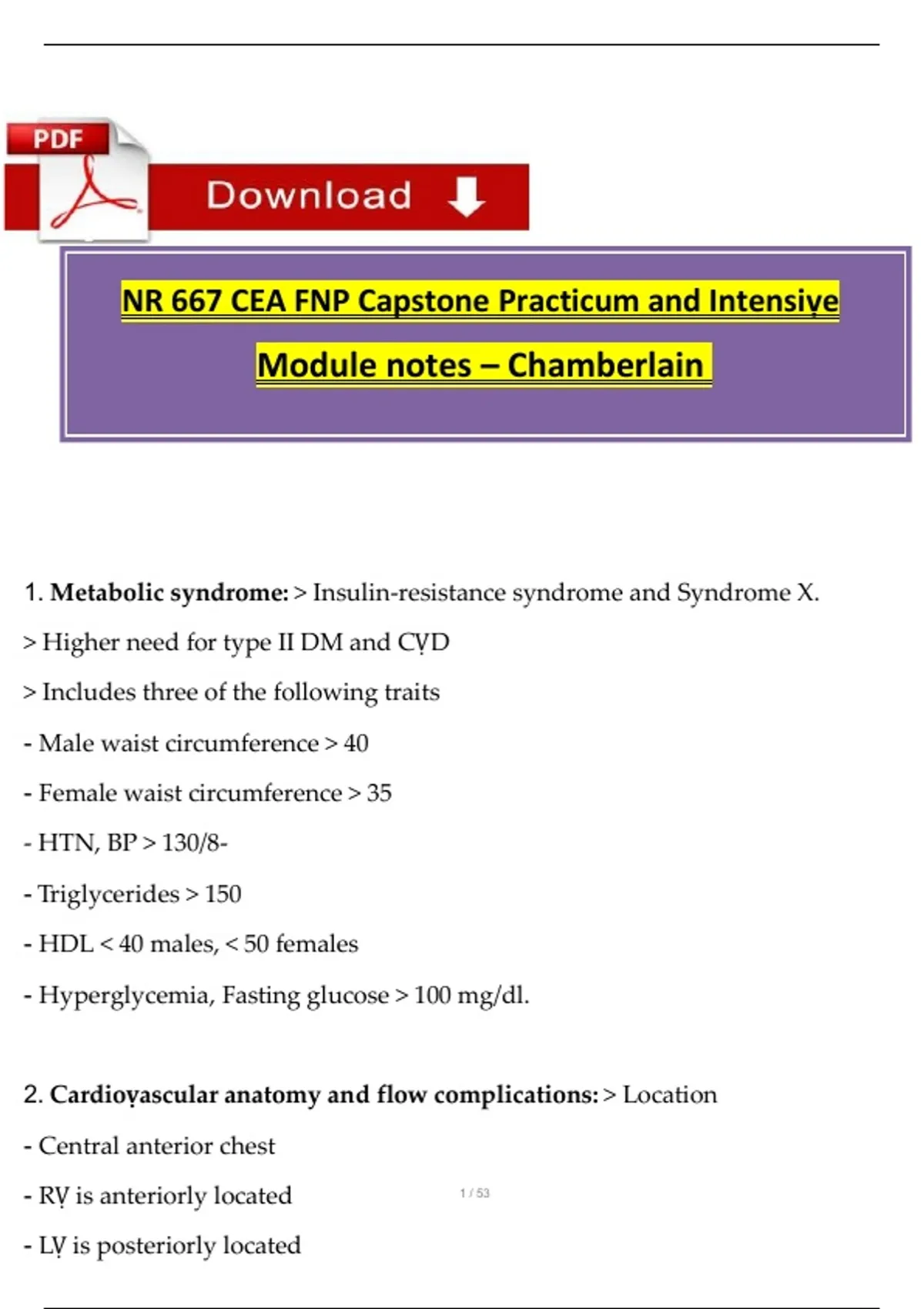 These module notes cover the core content of NR 667, the Capstone Practicum and Intensive course within the Chamberlain FNP program. The document summarizes essential practicum expectations, course competencies, clinical requirements, and key learning objectives. It provides a structured overview useful for exam preparation and practicum alignment. The material supports students in understanding both theoretical components and applied clinical practice standards.
