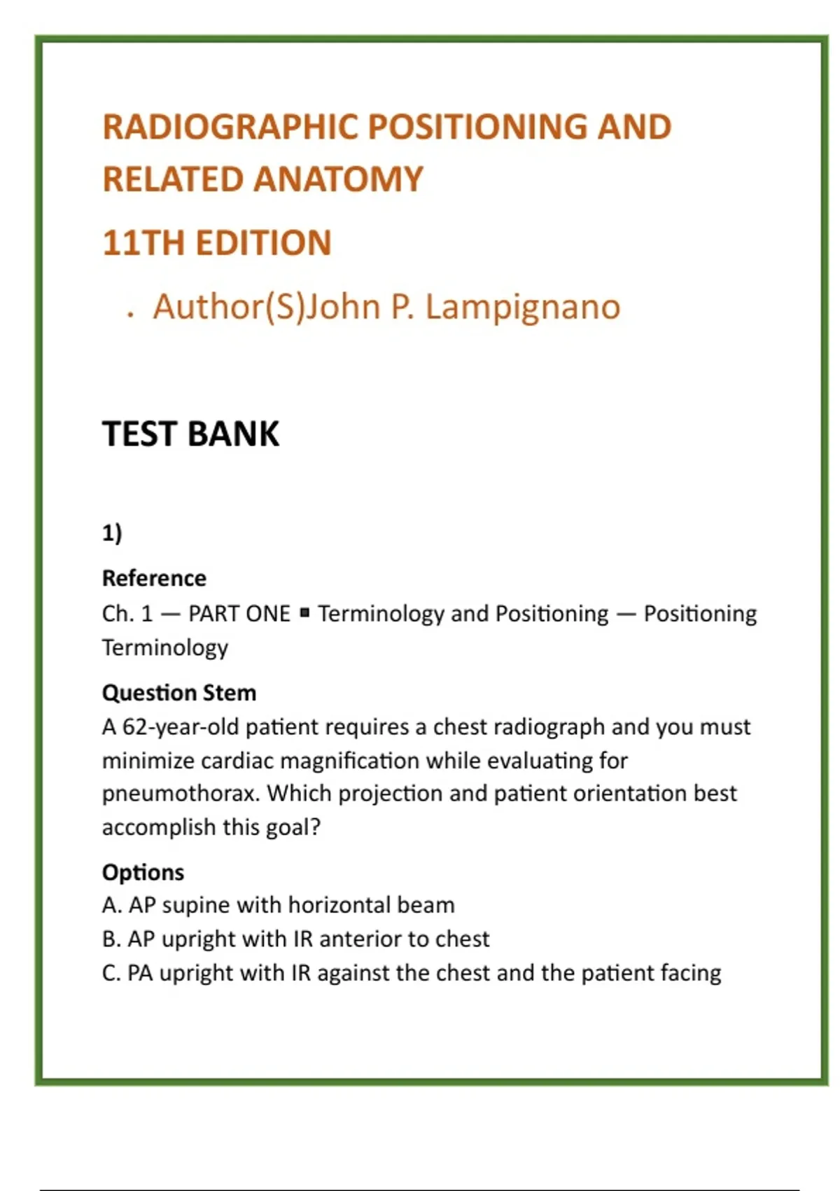 Radiography Test Bank for Radiographic Positioning & Related Anatomy (11th Ed., Lampignano) – Full-Chapter MCQs & Study Guide