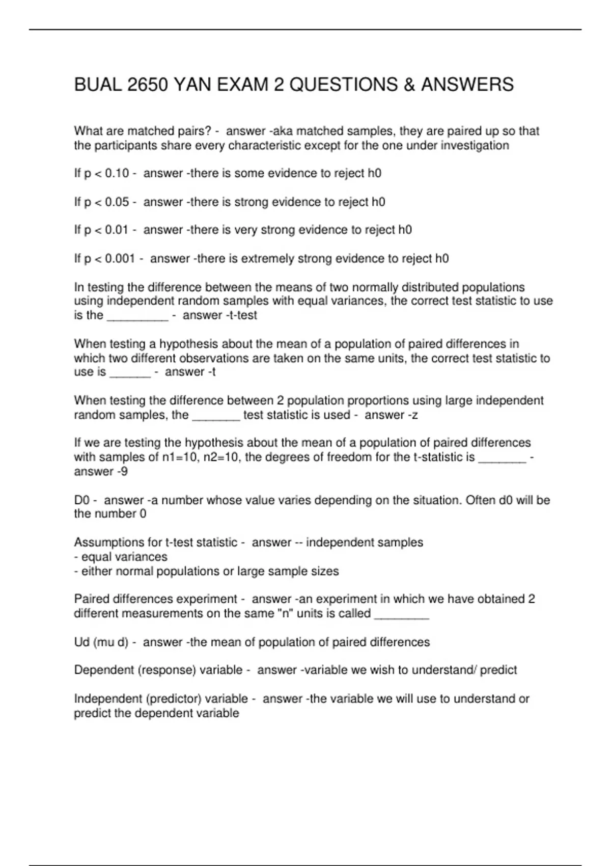 BUAL 2650 YAN EXAM 2 QUESTIONS & ANSWERS