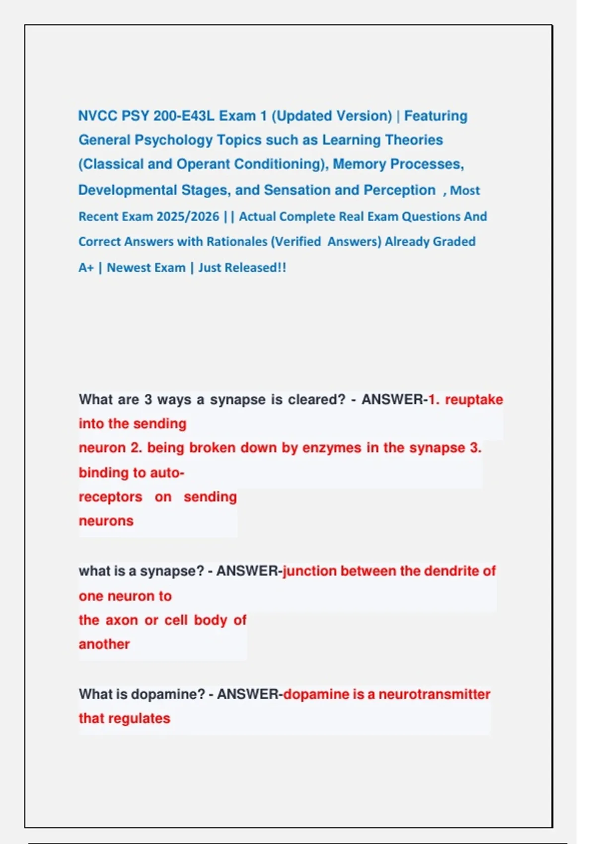 What are 3 ways a synapse is cleared? - ANSWER-1. reuptake