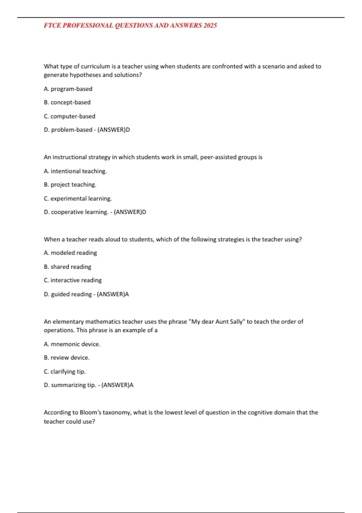 , FTCE PROFESSIONAL QUESTIONS AND ANSWERS 2025