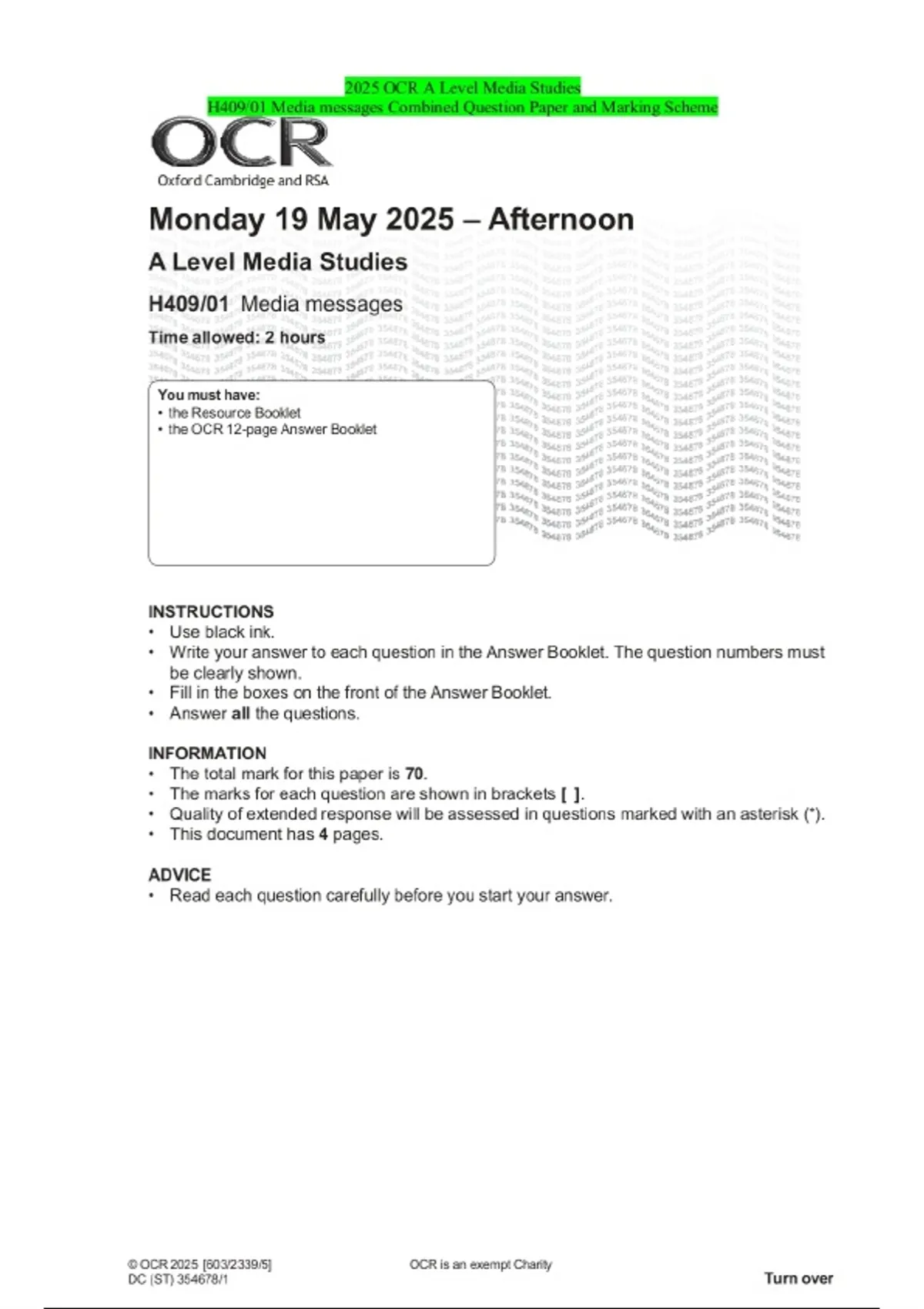 2025 OCR A Level Media Studies H409/01 Media messages Combined Question Paper and Marking Scheme
