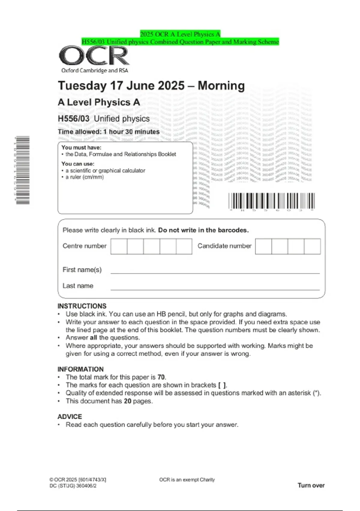 2025 OCR A Level Physics A H556/03 Unified physics Combined Question Paper and Marking Scheme