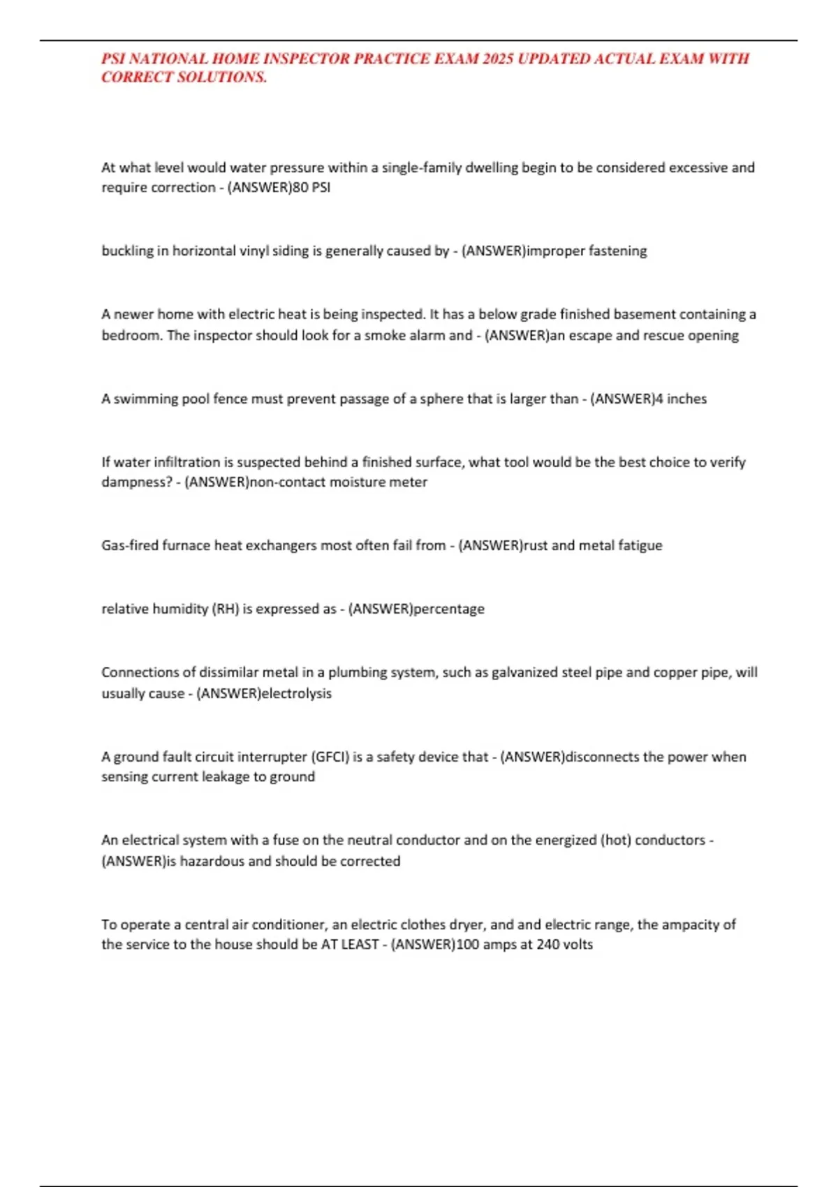 PSI NATIONAL HOME INSPECTOR PRACTICE EXAM 2025 UPDATED ACTUAL EXAM WITH