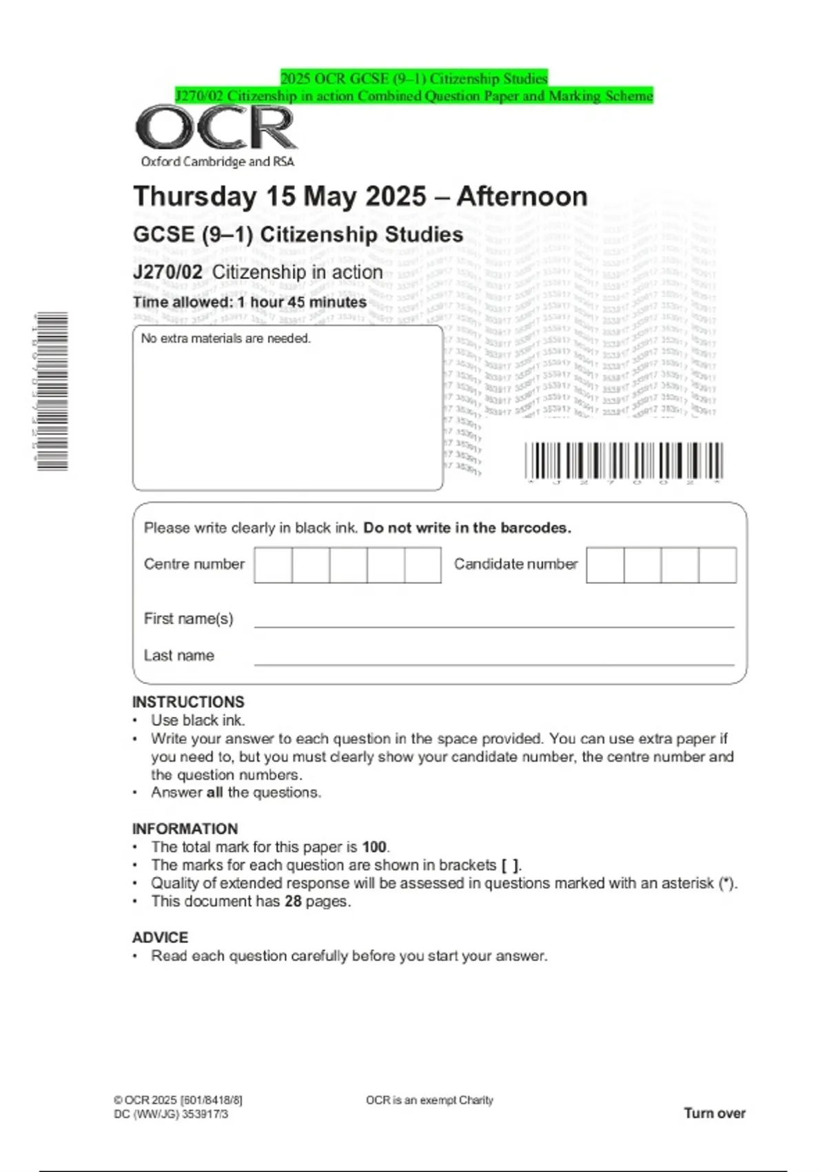 2025 OCR GCSE (9–1) Citizenship Studies J270/02 Citizenship in action Combined Question Paper and Marking Scheme