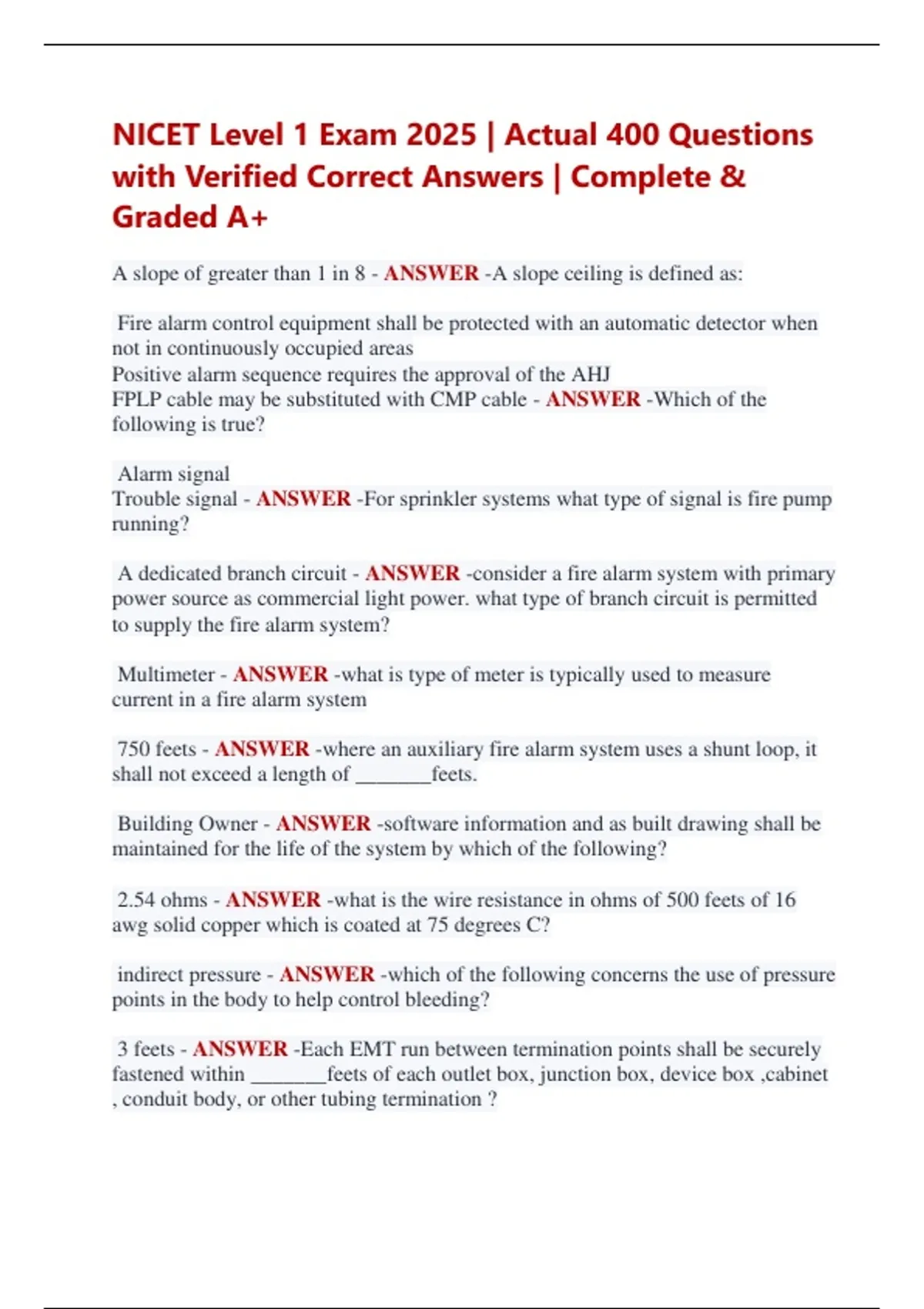 NICET Level 1 Exam 2025 | Actual 400 Questions with Verified Correct Answers | Complete & Graded A+ A slope of greater than 1 in 8 - ANSWER -A slope ceiling is defined as: Fire alarm control equipment shall be protected with an automatic detector when not in continuously occupied areas Positive alarm sequence requires the approval of the AHJ FPLP cable may be substituted with CMP cable - ANSWER -Which of the following is true? Alarm signal Trouble signal - ANSWER -For sprinkler systems what type of signal is fire pump running? A dedicated branch circuit - ANSWER -consider a fire alarm system with primary power source as commercial light power. what type of branch circuit is permitted to supply the fire alarm system? Multimeter - ANSWER -what is type of meter is typically used to measure current in a fire alarm system 750 feets - ANSWER -where an auxiliary fire alarm system uses a shunt loop, it shall not exceed a length of _______feets. Building Owner - ANSWER -software information and as built drawing shall be maintained for the life of the system by which of the following? 2.54 ohms - ANSWER -what is the wire resistance in ohms of 500 feets of 16 awg solid copper which is coated at 75 degrees C? indirect pressure - ANSWER -which of the following concerns the use of pressure points in the body to help control bleeding? 3 feets - ANSWER -Each EMT run between termination points shall be securely fastened within _______feets of each outlet box, junction box, device box ,cabinet , conduit body, or other tubing termination ? 5 telephones - ANSWER -two way shall be tele capable of permitting the simultaneous operation of any ______telephone stationsin a commun talked mode 13 wires of 12 AWG - ANSWER -Consider a 4x4 Square electrical box that is 2 1/8" deep. what is the maximum number of 12 AWG conductor which can be used? 10 feets - ANSWER -EMT shall be security fastener in place at least every____feets Maintained in safe condition - ANSWER -all hand and power tools,whether furnished by employee or employer, shall be? Very Extra High - ANSWER -A green color code green indication on a heat detector indicates what operating temperature classification ? 4.04 ohms - ANSWER -What is the wire resistance in ohm of 500 feet of 18 AWG solid copper which is a coated at 75 degrees C? 96" AFF and a least 6" below the ceiling - ANSWER -what is the appropriate mounting high for audible notification appliance? listed - ANSWER -A multi criteria device shall be ____ for the primary function of the device 15% - ANSWER -Spaces separated by a partition shall be considered as separate room for projected beam smoke detectors when the partition extend to within what percentage of the ceiling high? Soft tissue injuries - ANSWER -which of the following is caused by muscle pains and spams? 3.19 ohm - ANSWER -what is the wire resistance in ohms, of 1000 feet of 14 AWG solid copper which is coated at 75 degrees C? 200 seconds - ANSWER -a trouble signal shall be indicated and recorded with____seconds? Shunt - ANSWER -What type of auxiliary fire alarm system does not permit the use of automatic detectors? 110 % - ANSWER -A steam pressure supervisory shall indicate a low pressure condition .The off normal signal be initiated prior to the pressure falling below _____% of the minimum operating equipment supplied? 7 AMP - ANSWER -A non power limited fire alarm circuit which 18 AWG shall have over current protection not to exceed ___ amperes? The system designer - ANSWER -the features for non required system shall be established by _____ on the basis of the goals and objectives of the building owner ? 8.08 ohm - ANSWER -What is the resistance in ohms, of 1000 feet of 18 AWG solid copper which is coated at 75 degrees C? Listing - ANSWER -The effect of guards, covers, or lents on the appliances field performance shall be in accordance with _____requirements? monthly - ANSWER -What is the testing frequency for household smoke alarm ? Proprietary Supervisory Station Service - ANSWER -What type of supervising station fire alarm system is characterized by the bldg .Which are protected and the supervising station being under the same ownership? FPLP - ANSWER -which of the following are acceptable cable for use in an environmental air return space ? monthly - ANSWER -Consider a household fire alarm system which communicates to a supervising station .What type is the testing frequency for the communication path? 2 devices - ANSWER -In corridors where more than _____ visible notification appliances are in any field of view they ,shall be synchronized. 6 smk det - ANSWER -Consider a room with smooth a flat 10' ceiling which is 60' x 90' .What is the minimum number of smoke detectors required to cover this space?