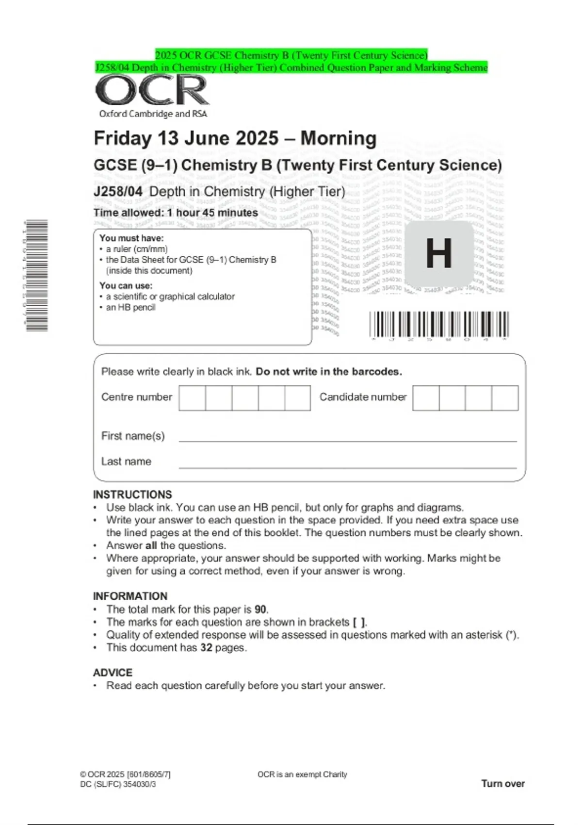 2025 OCR GCSE Chemistry B (Twenty First Century Science) J258/04 Depth in Chemistry (Higher Tier) Combined Question Paper and Marking Scheme