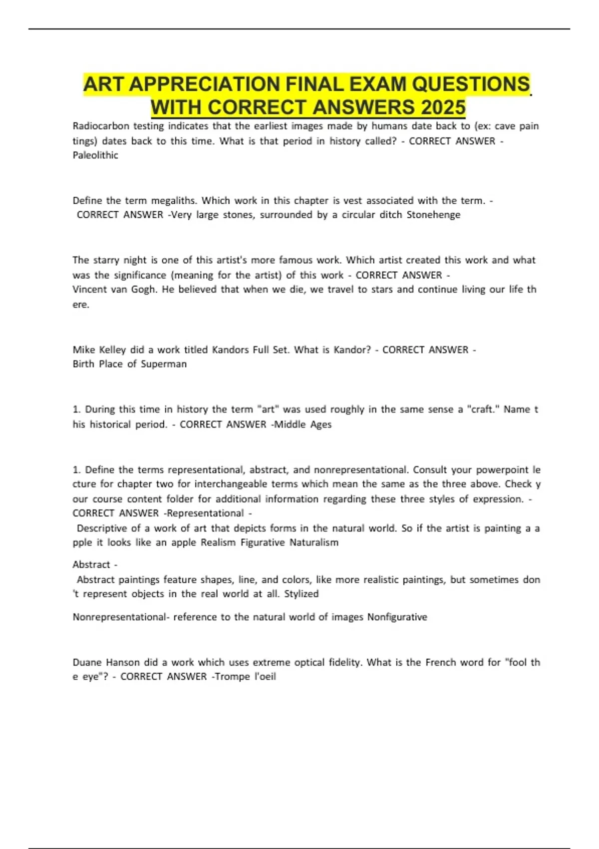 ART APPRECIATION FINAL EXAM QUESTIONS WITH CORRECT ANSWERS 2025